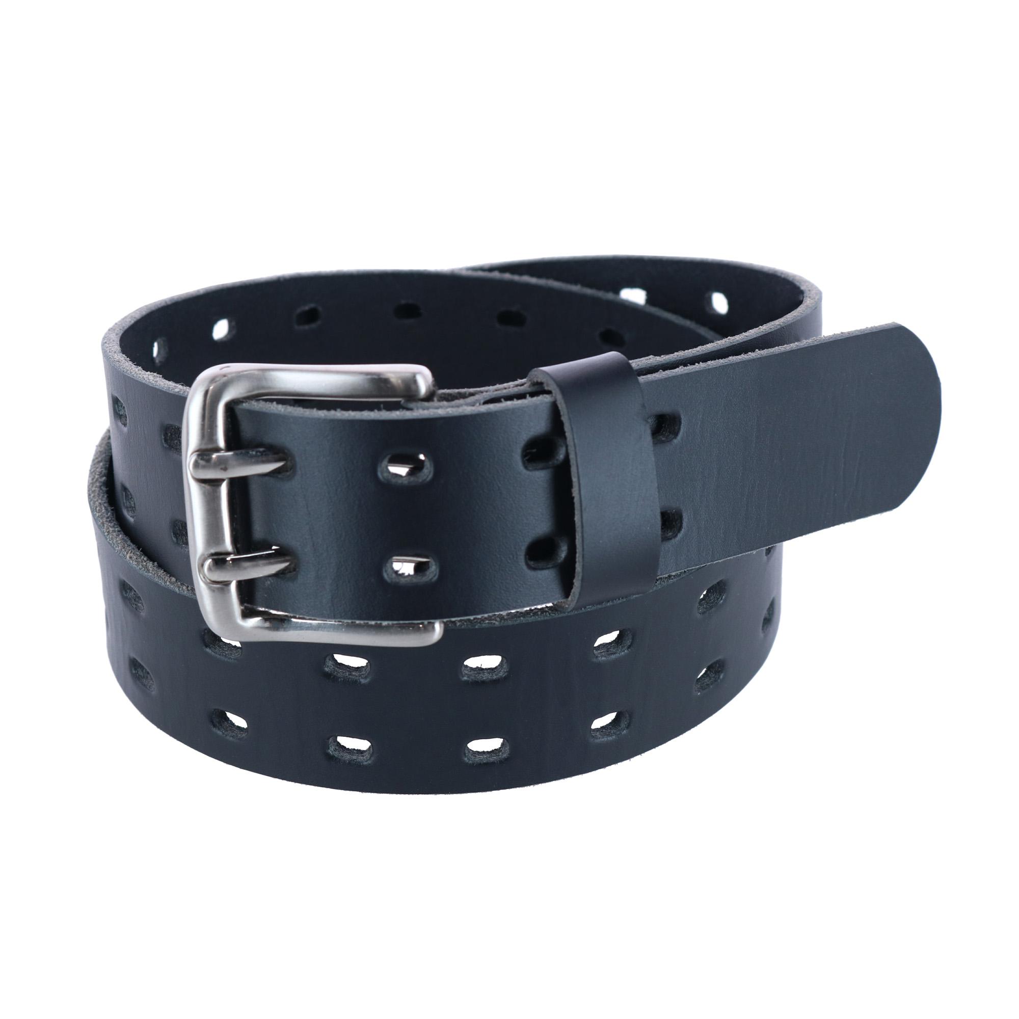 This full grain leather accessory will be your new everyday belt. Complete your casual look whether you're running errands or going out on the weekend. This unique strap features two rows of cutouts down the entire belt and a rectangle silver buckle. Measures 1 1/4 inch or 32 mm wide. Double hole cut out design. Beautiful silver buckle with double prongs. No stitching on the ends for a sleek look and features a single loop keeper. Pairs well with jeans; perfect for a casual look.