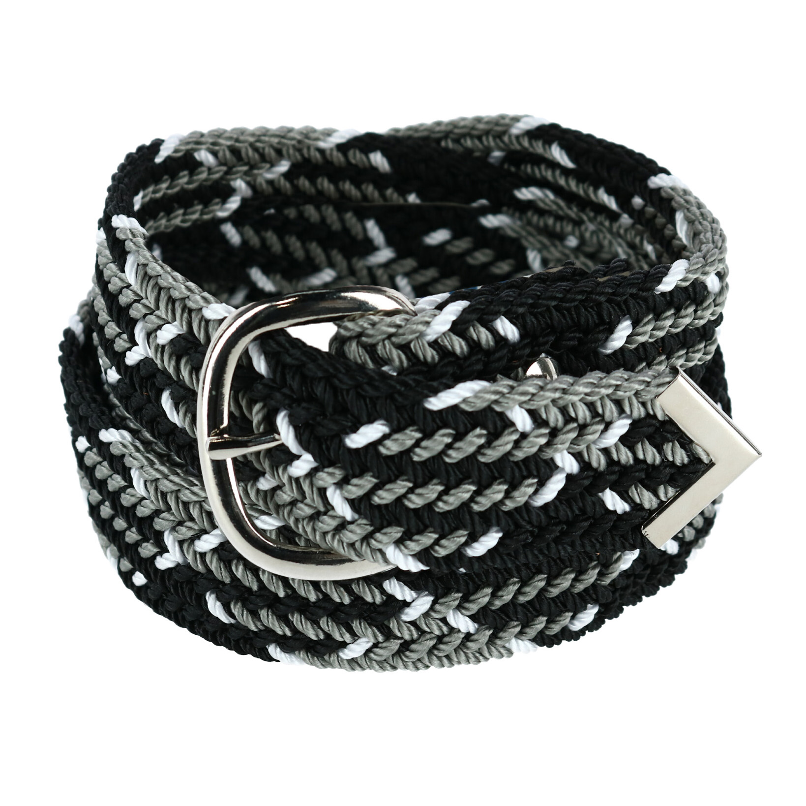 A polished silver tone buckle and tip sets this belt above the standard fabric belts. Durable nylon is woven into a unique pattern with black white and grey. With no holes it is fully adjustable up to 52 inches. Measures 1.5 inches or 38mm in width. Adjusts to fit up to 52 inches. The polished silver tone belt buckle matches the end tip. Black white and grey woven together with nylon cord. The nylon cord makes this belt durable to stand the test of time.