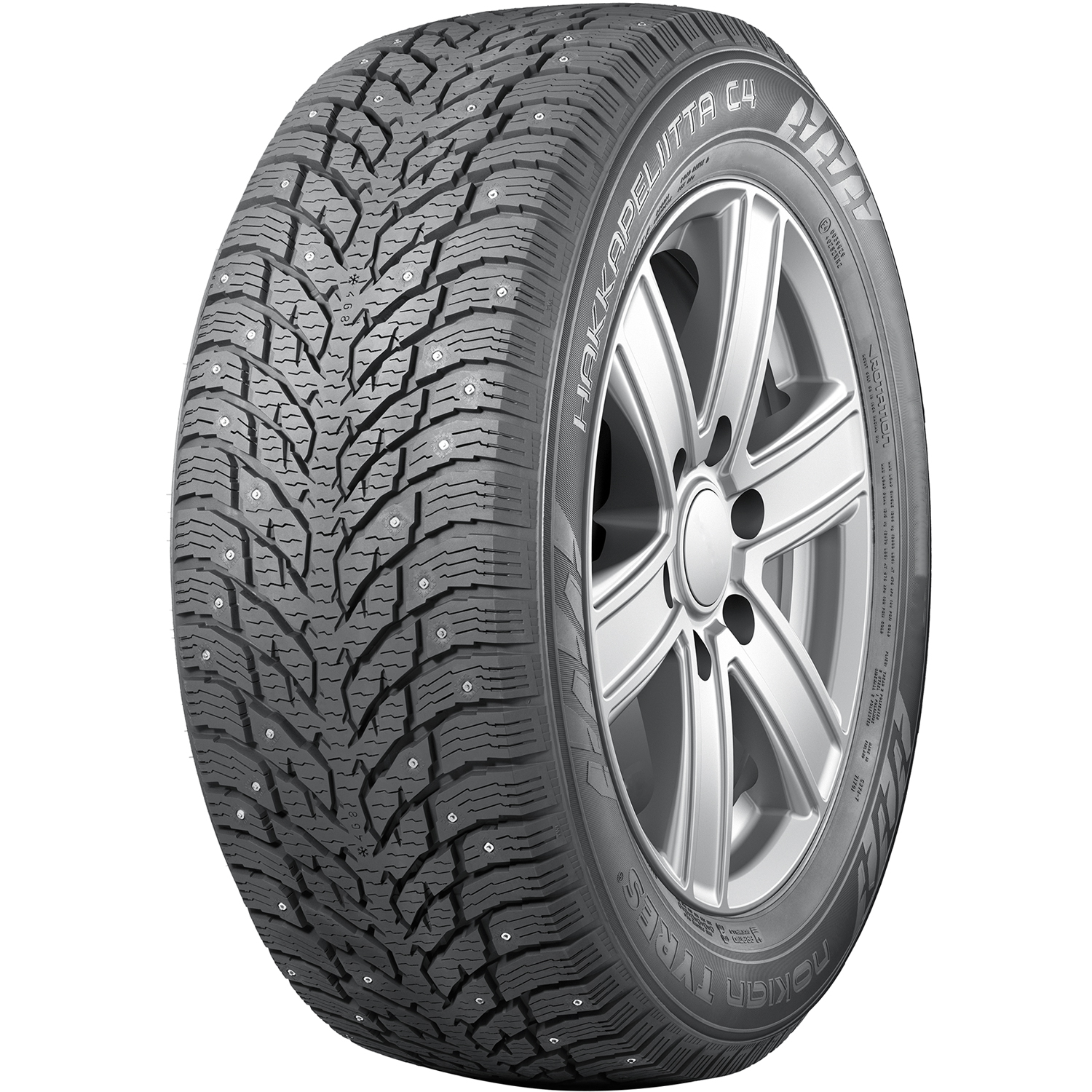 Nokian Tyres Hakkapeliitta C4. FEATURES AND BENEFITS: Winter weather traction; Enhanced controllability; Upgraded load durability; Studded tire model; . OVERVIEW: The Nokian Tyres Hakkapeliitta C4 is a highway terrain, winter tire made for commercial vans. This model is made for electric vehicles.The directional tread pattern and the winter compound enhance the tire's winter-weather performance. The tread area is studded, which helps the tire have a better grip on ice- and snow-covered roads. In this manner, the optimized tread elements firmly grip the surface with extra biting edges, while the winter compound keeps the rubber pliable in freezing temperatures. At the same time, the optimized grooves effectively eliminate water and slush from the footprint in order to resist hydroplaning.Excellent controllability is promoted with this model. The directional tread pattern and the special silica compound enhance the tire's contact with the road. It improves the tire's steering responsiveness and driving stability. The tire's steering response time is quicker and more precise to the driver's instructions, while the structure is secured against driving pressure. On the other hand, the wide shoulder blocks and the special siping details boost the tire's cornering and maneuvering throughout the performance. This combination enables the driver to have full control over the vehicle.The Nokian Tyres Hakkapeliitta C4 boosts its load and driving durability. The strengthened internal structure and the optimal compound blend maintain the optimal tire shape under load and driving pressure. As the tire does not deform under pressure, it can easily carry and withstand heavy loads. This load-carrying capacity upgrades the tire's handling power and durability, making this model perfect for commercial vans.Manufacturers recommend changing tires every 10 years. As long as tires are properly stored before they are sold, the year of their manufacture will not shorten their service life.