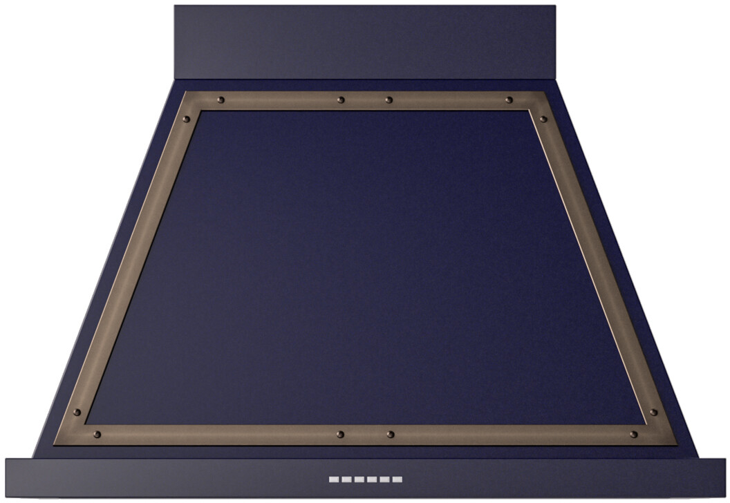 36" Wall Mount Range Hood with 3-Speeds + Intensive, 600 CFM, Front LED Bar, Anodised Aluminium Filters, and Delay Shut-Off: Midnight Blue, Bronze Trim. 3-speed including intensive mode provides 600 cfm (850 cfm on select models) to remove smoke and heat to keep your kitchen fresh. Illuminates your cooking area for enhanced visibility. Range hood filter made with high-quality anodized aluminum, is designed to capture and hold airborne grease released from cooking. Leave the kitchen after you are done cooking and let the hood continue removing unwanted smoke, turning it off by itself with the automatic delayed shutdown mode. Maintain peak performance with the automatic filter cleaning warning light, which alerts you when it's time to clean the filters, ensuring optimal airflow and efficiency. With a maximum power output of 450 Watts, this range hood delivers robust performance, efficiently extracting smoke, grease, and cooking odors from the kitchen environment. Its high-power operation ensures rapid ventilation, keeping the air clean and fresh during intense cooking sessions. Experience effortless cooking with the push button control feature, allowing you to easily adjust the fan speed and lighting with a simple touch. Name: Nostalgie. Type: Hood. Glass Canopy: No. Style: Canopy Pro Style. Duct Type: Round. Blower Type: Internal. Mounting Type: Wall Mount. CFM: 600 CFM. Light Bulb Type: LED. Number of Fan Speeds: 3 or More. Delay Turn Off: Yes. Filter Type: Mesh. Fan: Yes. Light: Yes. Luxury: Yes. Handcrafted from Italy: Yes. High-End Workmanship: Yes. Anodized Aluminum Grease Filters: Yes. Strip LED Lighting: Yes. Delay Shut Off: Yes. Volts: 115 Volts. Amps: 3.8 Amps. Frequency: 60 Hz. Exterior Width: 36". Width: 35 7/8". Depth: 19 3/4". Height: 26". Duct Size: 5 7/8".