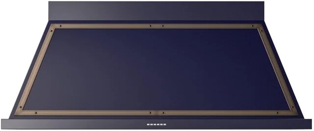 60" Wall Mount Range Hood with 3-Speeds + Intensive, 600 CFM, Front LED Bar, Anodised Aluminium Filters, and Delay Shut-Off: Midnight Blue, Bronze Trim. 3-speed including intensive mode provides 600 cfm (850 cfm on select models) to remove smoke and heat to keep your kitchen fresh. Illuminates your cooking area for enhanced visibility. Range hood filter made with high-quality anodized aluminum, is designed to capture and hold airborne grease released from cooking. Leave the kitchen after you are done cooking and let the hood continue removing unwanted smoke, turning it off by itself with the automatic delayed shutdown mode. Maintain peak performance with the automatic filter cleaning warning light, which alerts you when it's time to clean the filters, ensuring optimal airflow and efficiency. With a maximum power output of 450 Watts, this range hood delivers robust performance, efficiently extracting smoke, grease, and cooking odors from the kitchen environment. Its high-power operation ensures rapid ventilation, keeping the air clean and fresh during intense cooking sessions. The range hood features a durable construction, with a painted steel body providing strength and resilience against wear and tear. Additionally, the AISI 304 stainless steel variant offers enhanced corrosion resistance and a sleek, modern appearance, making it ideal for contemporary kitchen designs. Experience effortless cooking with the push button control feature, allowing you to easily adjust the fan speed and lighting with a simple touch. Name: Nostalgie. Type: Hood. Glass Canopy: No. Style: Canopy Pro Style. Duct Type: Round. Blower Type: Internal. Mounting Type: Wall Mount. CFM: 600 CFM. Light Bulb Type: LED. Number of Fan Speeds: 3 or More. Delay Turn Off: Yes. Filter Type: Mesh. Fan: Yes. Light: Yes. Luxury: Yes. Handcrafted from Italy: Yes. High-End Workmanship: Yes. Anodized Aluminum Grease Filters: Yes. Strip LED Lighting: Yes. Delay Shut Off: Yes. Volts: 120 Volts. Amps: 15 Amps. Frequency: 60 Hz. Exterior Width: 60". Width: 59 1/2". Depth: 19 3/4". Height: 26". Duct Size: 5 7/8".