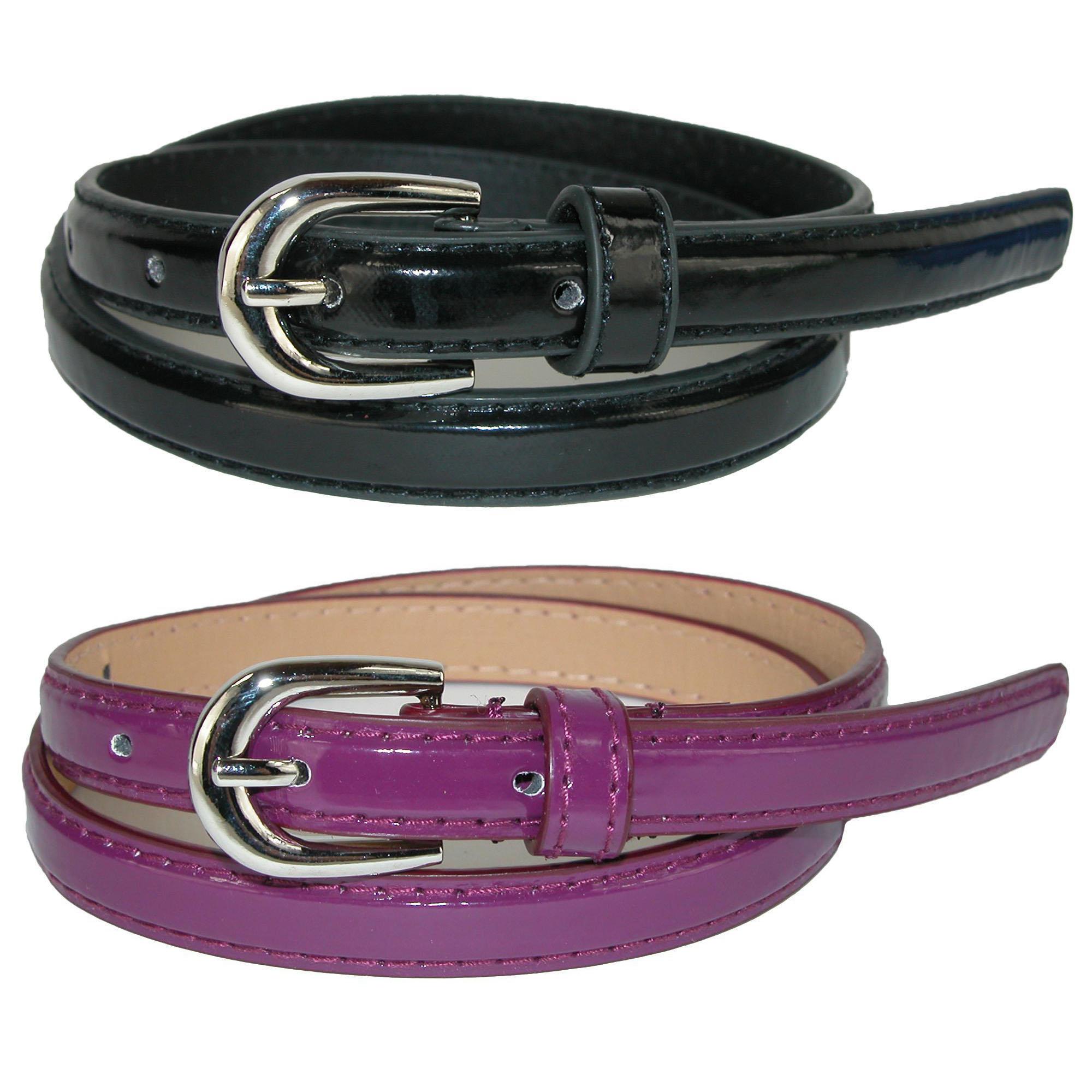 Whether you use it for dress or play this belt can complete any outfit. Many colors to choose from - get 1 Black and 1 color of your choosing. Skinny belt fashion that can dress up or down. Measures .5 inches or 13mm in width. Choose from many versatile colors. Comes in a set of 1 black and 1 color of your choice. Polished nickel rounded buckle. Stitched edges.