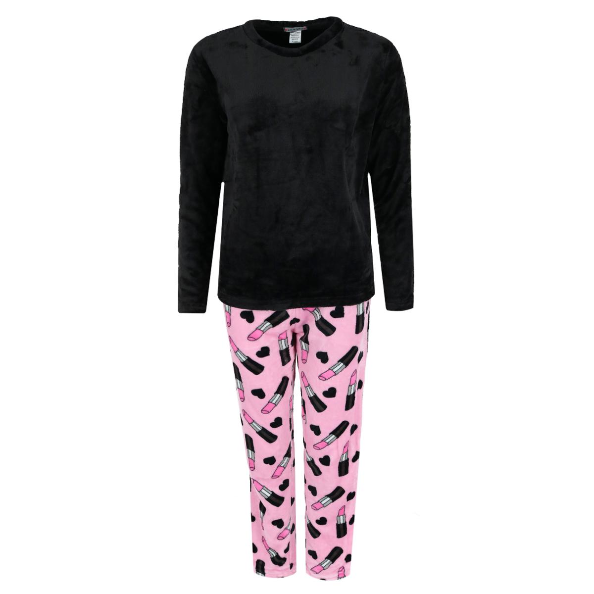 This pajama set would make a great gift. It is a super soft and plush fabric that will keep you warm all winter long. This is for your makeup lovers who love the colors pink and black. The top is a crewneck long sleeve with open bottom pants. The pants have an elastic waistband with a decorative black bow. It will feel like you're wrapped up in a blanket while wearing this cozy set. Super soft and plush fabric. Solid black crewneck top. Open bottom pants. Cute pink and black makeup and hearts pattern. Elastic waistband with decorative black bow.