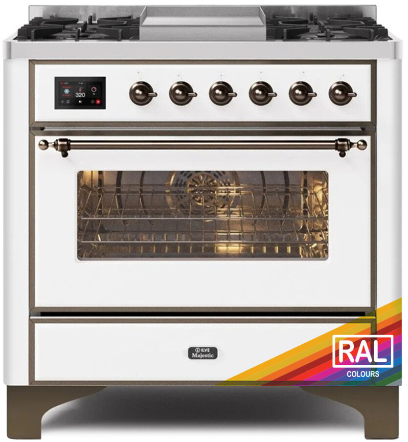 Freestanding Dual Fuel Gas Range with 6 Sealed Burners, 3.5 Cu. Ft. Capacity, Storage-Warming Drawer, Continuous Grates, Self-Clean, Griddle, and Nano-Tech Non-Stick Coated Burners: RAL Classic, Bronze Trim. Features semi-sealed burners with various BTUs to cook whatever you want, however, you want. It gives plenty of space to cook multiple dishes. Gives the option to use the residual heat of the oven to keep cooked food warm or warm your dishes before serving. Continuous cast-iron grates let you slide pots easily on and off heat, or from one burner to another. Makes cooking simpler by eliminating messy clean-up. Powerful performance with delicate control so that not only your range but your meals become works of art. A durable brass burner ring is treated with a non-stick nanotechnological coating that facilitates easy cleaning. Efficient Gas Supply provides up to 20,000 BTU burner power. Minimal temperature fluctuation for optimal cooking; temperature spikes, uniform cooking, energy saving. Temperature is adjustable from 85F for perfect leavening. Safe for children, perfectly insulated thanks to the three glass panes, easy to clean thanks to the new structure of the door. ILVE ovens maintain a European standard A+ energy rating, that's why ILVE ovens are equipped with a fast pre-heat mode to assist your oven to reach cooking temperature quicker and more efficiently. ILVE freestanding cookers have a sealed oven cavity that traps moisture in the oven cavity ensuring that your meats remain moist and succulent!. Each unit is individually made and assembled by hand because there's no substitute for the expert eye and hand of the specialist craftsman. Ilve combines beautiful classic aesthetics with professional performance and materials used in professional kitchens: steel, AISI 304 stainless steel, enamel, cast iron, brass, and copper. Simple and intuitive digital control provides you with straightforward graphics that make operating your oven simple and easy. Quality Italian brass burners offer a touch of elegance to your cooktop. Ideal for lovers of exotic cuisine, it is ideally suited for Chinese wok, as well as large pots and pans. Additionally, you can turn off the flames from the outer ring for use as a simmer burner. True European Convection. Pizza Function. Defrost Function. Quick Start Preheat. Intense Cooking. Fan Grill Cooking. Closed Door Grill Cooking. Top Cooking. Normal Static Cooking. Bottom Cooking. Multiple Fan Cooking. Gas Conversion Kit Included. Range Type: Freestanding. Fuel Type: Dual Fuel, Natural Gas. Viewing Window: Yes. Number of Ovens: Single. Digital Clock: Yes. Timer: Yes. Clean Type: Self-Cleaning. Burner Type: Sealed Burner. Control Type: Knobs. Control Type Place: Front. Burners Number: 6. Burner Type: Brass. Cooktop Surface: Deep Recessed. Griddle: Included (depends on model). Grill: Not Included. Front Left Output: 20,000 BTU. Back Left Output: 10,500 BTU. Front Right Output: 7,000 BTU. Back Right Output: 10,500 BTU. Front Center: 7,000 BTU. Back Center: 10,500 BTU. Oven Type: Convection Oven. Oven Control Type: TFT Display. Oven Control Type Place: Front. Number of Racks: 2. Broiler: Yes. Interior Oven Light: Yes. Conversion Kit: Included. Voltage: 240V. Amperage: 18.1A. Frequency: 60Hz. Width: 35 7/8". Depth: 27 2/8". Height: 36". Main Oven Interior Dimensions: 26 3/8" x 14 3/8" x 16 1/8". Shipping Weight: 319.7 lbs. Product Weight: 287.7 lbs. Parts & Labor: 2 Years Limited.