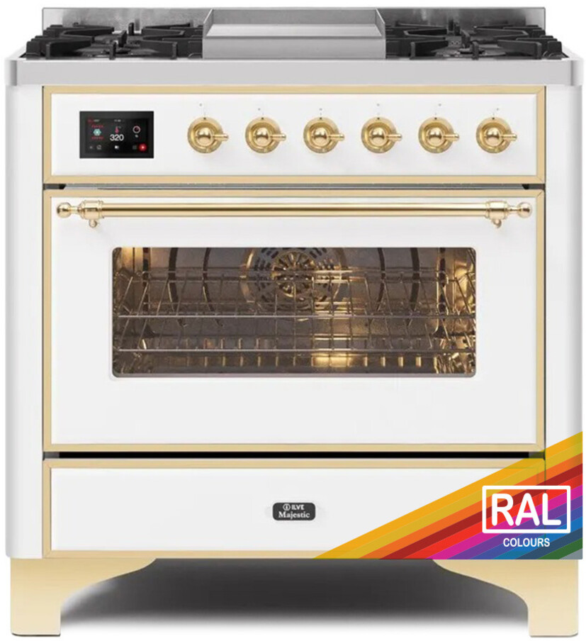 Freestanding Dual Fuel Gas Range with 6 Sealed Burners, 3.5 Cu. Ft. Capacity, Storage-Warming Drawer, Continuous Grates, Self-Clean, Griddle, and Nano-Tech Non-Stick Coated Burners: RAL Classic, Brass Trim. Features semi-sealed burners with various BTUs to cook whatever you want, however, you want. It gives plenty of space to cook multiple dishes. Gives the option to use the residual heat of the oven to keep cooked food warm or warm your dishes before serving. Continuous cast-iron grates let you slide pots easily on and off heat, or from one burner to another. Makes cooking simpler by eliminating messy clean-up. Powerful performance with delicate control so that not only your range but your meals become works of art. A durable brass burner ring is treated with a non-stick nanotechnological coating that facilitates easy cleaning. Efficient Gas Supply provides up to 20,000 BTU burner power. Minimal temperature fluctuation for optimal cooking; temperature spikes, uniform cooking, energy saving. Temperature is adjustable from 85F for perfect leavening. Safe for children, perfectly insulated thanks to the three glass panes, easy to clean thanks to the new structure of the door. ILVE ovens maintain a European standard A+ energy rating, that's why ILVE ovens are equipped with a fast pre-heat mode to assist your oven to reach cooking temperature quicker and more efficiently. ILVE freestanding cookers have a sealed oven cavity that traps moisture in the oven cavity ensuring that your meats remain moist and succulent!. Each unit is individually made and assembled by hand because there's no substitute for the expert eye and hand of the specialist craftsman. Ilve combines beautiful classic aesthetics with professional performance and materials used in professional kitchens: steel, AISI 304 stainless steel, enamel, cast iron, brass, and copper. Simple and intuitive digital control provides you with straightforward graphics that make operating your oven simple and easy. Quality Italian brass burners offer a touch of elegance to your cooktop. Ideal for lovers of exotic cuisine, it is ideally suited for Chinese wok, as well as large pots and pans. Additionally, you can turn off the flames from the outer ring for use as a simmer burner. True European Convection. Pizza Function. Defrost Function. Quick Start Preheat. Intense Cooking. Fan Grill Cooking. Closed Door Grill Cooking. Top Cooking. Normal Static Cooking. Bottom Cooking. Multiple Fan Cooking. Gas Conversion Kit Included. Range Type: Freestanding. Fuel Type: Dual Fuel, Natural Gas. Viewing Window: Yes. Number of Ovens: Single. Digital Clock: Yes. Timer: Yes. Clean Type: Self-Cleaning. Burner Type: Sealed Burner. Control Type: Knobs. Control Type Place: Front. Burners Number: 6. Burner Type: Brass. Cooktop Surface: Deep Recessed. Griddle: Included (depends on model). Grill: Not Included. Front Left Output: 20,000 BTU. Back Left Output: 10,500 BTU. Front Right Output: 7,000 BTU. Back Right Output: 10,500 BTU. Front Center: 7,000 BTU. Back Center: 10,500 BTU. Oven Type: Convection Oven. Oven Control Type: TFT Display. Oven Control Type Place: Front. Number of Racks: 2. Broiler: Yes. Interior Oven Light: Yes. Conversion Kit: Included. Voltage: 240V. Amperage: 18.1A. Frequency: 60Hz. Width: 35 7/8". Depth: 27 2/8". Height: 36". Main Oven Interior Dimensions: 26 3/8" x 14 3/8" x 16 1/8". Shipping Weight: 319.7 lbs. Product Weight: 287.7 lbs. Parts & Labor: 2 Years Limited.