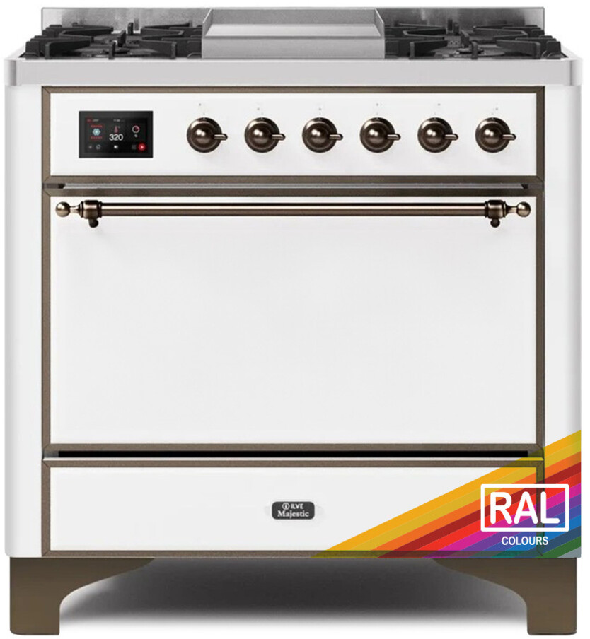 Freestanding Dual Fuel Range with 6 Sealed Burners, 3.5 cu. ft. Oven Capacity, Warming Drawer, Fast Pre-Heat, and Griddle: RAL Color, Bronze Trim - NG. A true kitchen centerpiece that is sure to demand attention, these exceptional bespoke ranges will complement any kitchen. The unique style of the Majestic Series stands out above the rest. ILVE offers the ability to create a customized and individual look. Brass is a noble material that guarantees excellent durability and the non-stick nanotechnological coating facilitates easy cleaning. Efficient Gas Supply provides up to 20,000 BTU burner power. Simple 4.3" TFT full touch screen, with intuitive and straightforward graphics, provides easy commands for selecting thermostat, timer, and automatic programmer for cooking start and finish timers. Minimal temperature fluctuation for optimal cooking; temperature spikes, uniform cooking, energy saving. Temperature is adjustable from 85F for perfect leavening. Continuous cast-iron grates let you slide pots easily on and off heat, or from one burner to another. ILVE ovens maintain a European standard A+ energy rating, that's why ILVE ovens are equipped with a fast pre-heat mode to assist your oven to reach cooking temperature quicker and more efficiently. ILVE freestanding cookers have a sealed oven cavity that traps moisture in the oven cavity ensuring that your meats remain moist and succulent! This also assists in less meat shrinkage while cooking. Italians are renowned the world over for their passion for design. Combined with exquisite craftsmanship this has produced some of the most desirable products and iconic brands. That same passion and craftsmanship drove our founders Eugenio Illoti and Evelino Berno to create their first commercial cooker in 1952. Featuring the highest green energy ratings in the industry, ILVE ranges maximize energy without compromising performance. Like the Energy Star ratings in the United States, the European EU rating scored all ILVE ranges an A, the highest possible score for performance and energy consumption. Total Capacity: 3.5 cu. ft. 4.3" full touch display. Precise electronic temperature control. Door and drawer with soft-closing system. Cooking probe. Cold door with triple removable glass. Pizza function. Defrosting. Intensive cooking. Quick start. Moist intensive cooking. Fan grill cooking. Grill cooking with closed-door. Cooking from above. Moist cooking from above. Cooking from below. Moist cooking from below. Static normal cooking. Moist static normal cooking. Multiple fan cooking. Multiple moist fan cooking. ECO cooking. Fuel Type: Natural Gas / Liquid Propane. Burners/Elements: 6 Sealed Burner. Surface: Deep Recessed Cooktop. Control: Knobs on the Front Side. Grate Type: Cast Iron Grate. Fuel: Electric Oven. Door Type: Removable Solid Door. Convection: Yes. Control Type: 4.3" TFT Touch Screen on the Front Side. Cleaning Type: Easy Clean Enamel Cavity. Light(s): Yes. Rack Holders: Plain. Soft Close Door: Yes. Broiler: Yes. Child Safety Lock: Yes. Timer: Yes. Built-in Thermostat: Yes. Internal Thermometer: Yes. Range Hood: No. Power Cord: Yes. Grates: Yes. Griddle: Yes. Legs: Yes. Backsplash: Yes. Conversion Kit: Yes. Oven Racks: Yes. Oven Trays: Yes. Rotisserie: Yes. Gas Regulator: Yes. Manual: Yes. Voltage: 240 V. Amperage: 30 A. Hertz: 60 Hz. Power Cord Type: Hard Wire - 4-wire. Power Cord Length: 45 11/16". Width: 35 7/8". Depth: 27 1/4". Height: 36". Product Weight: 320 lbs. Warranty: 2 Years Limited.