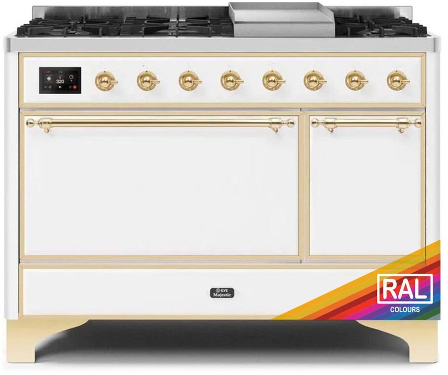 Freestanding Dual Fuel Range with 8 Sealed Burners, 5.02 cu. ft. Total Capacity, Warming Drawer, Fast Pre-Heat, and Griddle: RAL Color, Brass Trim. A true kitchen centerpiece that is sure to demand attention, these exceptional bespoke ranges will complement any kitchen. The unique style of the Majestic Series stands out above the rest. ILVE offers the ability to create a customized and individual look. Brass is a noble material that guarantees excellent durability and the non-stick nanotechnological coating facilitates easy cleaning. Efficient Gas Supply provides up to 20,000 BTU burner power. Simple 4.3" TFT full touch screen, with intuitive and straightforward graphics, provides easy commands for selecting thermostat, timer, and automatic programmer for cooking start and finish timers. Minimal temperature fluctuation for optimal cooking; temperature spikes, uniform cooking, energy saving. Temperature is adjustable from 85F for perfect leavening. Continuous cast-iron grates let you slide pots easily on and off heat, or from one burner to another. ILVE ovens maintain a European standard A+ energy rating, that's why ILVE ovens are equipped with a fast pre-heat mode to assist your oven to reach cooking temperature quicker and more efficiently. ILVE freestanding cookers have a sealed oven cavity that traps moisture in the oven cavity ensuring that your meats remain moist and succulent! This also assists in less meat shrinkage while cooking. Italians are renowned the world over for their passion for design. Combined with exquisite craftsmanship this has produced some of the most desirable products and iconic brands. That same passion and craftsmanship drove our founders Eugenio Illoti and Evelino Berno to create their first commercial cooker in 1952. Featuring the highest green energy ratings in the industry, ILVE ranges maximize energy without compromising performance. Like the Energy Star ratings in the United States, the European EU rating scored all ILVE ranges an A, the highest possible score for performance and energy consumption. Pizza function. Defrosting. Intensive cooking. Quick start. Moist intensive cooking. Fan grill cooking. Grill cooking with closed-door. Cooking from above. Moist cooking from above. Cooking from below. Moist cooking from below. Static normal cooking. Moist static normal cooking. Multiple fan cooking. Multiple moist fan cooking. ECO cooking. Grill cooking with closed-door. Cooking from above. Cooking from below. Static normal cooking. ECO cooking. Fuel Type: Natural Gas / Liquid Propane. Burners/Elements: 8 Sealed Burner. Surface: Deep Recessed Cooktop. Control: Knobs on the Front Side. Grate Type: Cast Iron Grate. Fuel: Electric Oven. Door Type: Removable Solid Door. Convection: Yes. Control Type: 4.3" TFT Touch Screen on the Front Side. Cleaning Type: Easy Clean Enamel Cavity. Light(s): Yes. Rack Holders: Plain. Soft Close Door: Yes. Broiler: Yes. Child Safety Lock: Yes. Timer: Yes. Built-in Thermostat: Yes. Internal Thermometer: Yes. Range Hood: No. Power Cord: Yes. Grates: Yes. Griddle: Yes. Legs: Yes. Backsplash: Yes. Conversion Kit: Yes. Oven Racks: Yes. Oven Trays: Yes. Rotisserie: Yes. Gas Regulator: Yes. Manual: Yes. Voltage: 240/220 V. Amperage: 40 A. Hertz: 60 Hz. Power Cord Type: Hard Wire - 4-wire. Power Cord Length: 45 11/16". Width: 47 7/8". Depth: 27 1/4". Height: 36". Shipping Dimensions: 49 7/16" W x 35 2/16" H x 33 4/16" D. Range Weight: 540 lbs. Shipping Weight: 560 lbs. Warranty: 2 Years Limited.