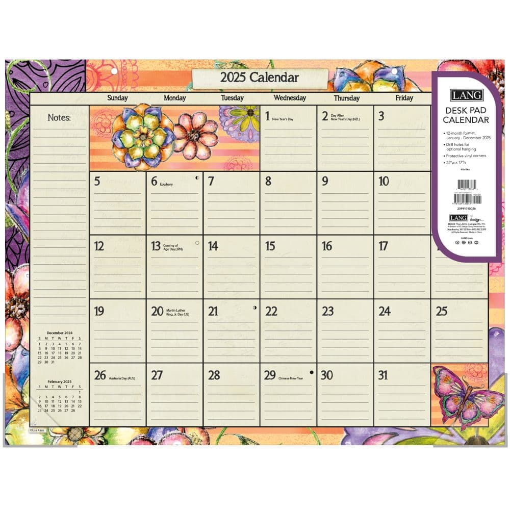 Enhance your workspace with the Lisa Kaus Color My World 2025 Desk Pad Calendar, featuring a vibrant and inspirational design that combines functionality with artistic flair. This desk pad calendar is perfect for anyone looking to add a touch of creativity to their daily planning. With its large monthly grid and colorful LANG artwork by Lisa Kaus, this calendar is not only a practical tool but also a beautiful desk accessory. Dimensions: 17.1 x 22.1 inches, providing ample space for daily notes and appointments. Adhesive binding ensures pages stay securely in place throughout the year. Includes clear plastic corner protectors to maintain durability and aesthetic appeal. Sturdy backer board offers a solid writing surface and protects your desk. Features major holidays and notable dates, helping you stay organized and informed. Each month displays a unique, colorful artwork by Lisa Kaus, making it a delightful way to track the year. The spacious grid layout offers plenty of room for jotting down appointments, reminders, and notes, ensuring you never miss an important date. Ideal for home or office use, this desk pad calendar helps you plan efficiently while brightening your workspace. Start planning your year in style with the Lisa Kaus Color My World 2025 Desk Pad Calendar. Order now to infuse your daily routine with art and organization!.