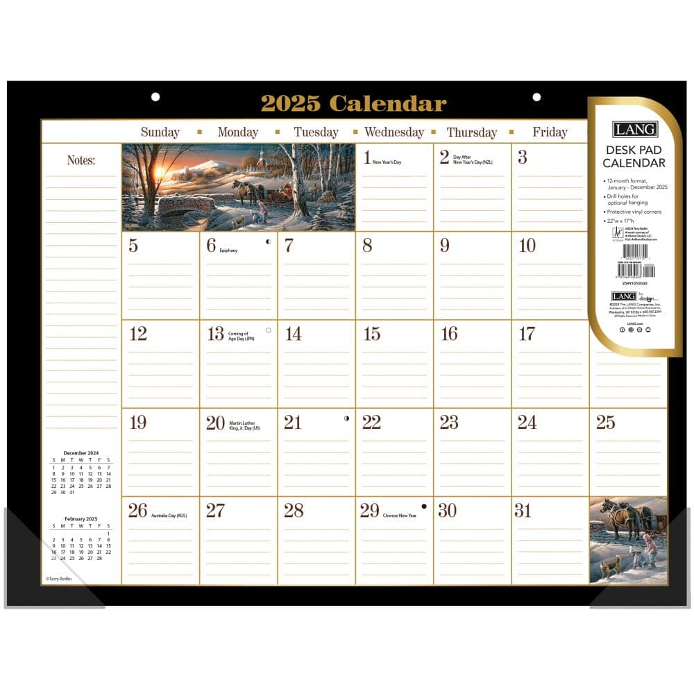 Experience the serene beauty of rural landscapes every day with the Terry Redlin 2025 Desk Pad Calendar. This elegantly designed desk pad features the iconic artwork of Terry Redlin, capturing the tranquil essence of countryside scenes. Perfect for home or office use, this calendar not only serves as a functional planner but also as a piece of art that brings a touch of nature indoors. Dimensions: 17.1" x 22.1", providing a large surface for daily planning and note-taking. Sturdy backer board and clear plastic corner protectors ensure durability and stability on any desk surface. Features a full 12-month calendar for 2025, starting from January 1st, with each month displayed on a separate page. Includes major U.S. and international holidays, helping you stay on top of important dates. Ample lined spaces for daily notes, appointments, and reminders, making it easy to organize your schedule. Crafted with high-quality materials and binding, the Terry Redlin 2025 Desk Pad Calendar is designed to withstand the rigors of daily use while keeping you organized and inspired. The adhesive binding allows for easy page turning, and the calendar includes a mini-view of the previous and next months for quick reference. Enhance your desk with functionality and scenic beauty. Order the Terry Redlin 2025 Desk Pad Calendar today and plan your year in style!.