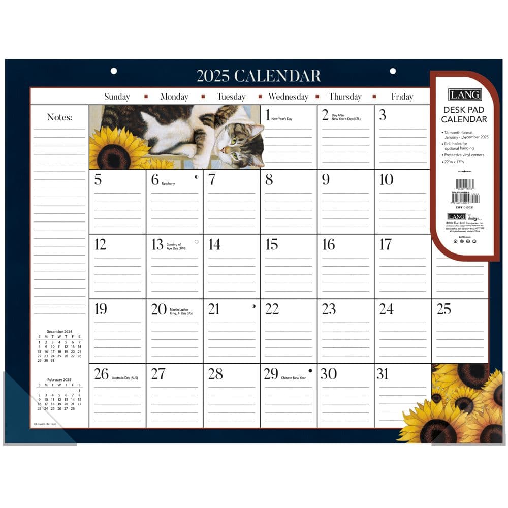 Stay organized and inspired throughout 2025 with the 2025 American Cat Desk Pad Calendar by Lowell Herrero from The LANG Companies. This beautifully designed desk pad features charming artwork of adorable cats by renowned artist Lowell Herrero, making it a perfect addition to any cat lover's workspace. Enjoy a large, easy-to-read monthly calendar grid, complemented by vibrant and playful cat illustrations that bring a touch of whimsy to your daily planning. Dimensions: 17.1" x 22.1", providing ample space for daily notes and appointments. Sturdy backer board and clear plastic corner protectors ensure durability and stability on any desk surface. Adhesive binding allows for easy page turning while keeping the calendar secure. Includes major U.S. and international holidays to keep you up to date with important celebrations. Made with high-quality materials, ensuring longevity and a pleasant tactile experience. This desk pad not only serves as a practical tool for organization but also as a delightful piece of art that brightens your day. The large grid spaces are perfect for jotting down notes, appointments, and reminders, ensuring you stay organized all year long. Enhance your desk's functionality and aesthetics with the 2025 American Cat Desk Pad Calendar by Lowell Herrero. Perfect for cat enthusiasts and art lovers alike, it's time to plan your year in style. Order now and make every day a little more joyful and organized!.