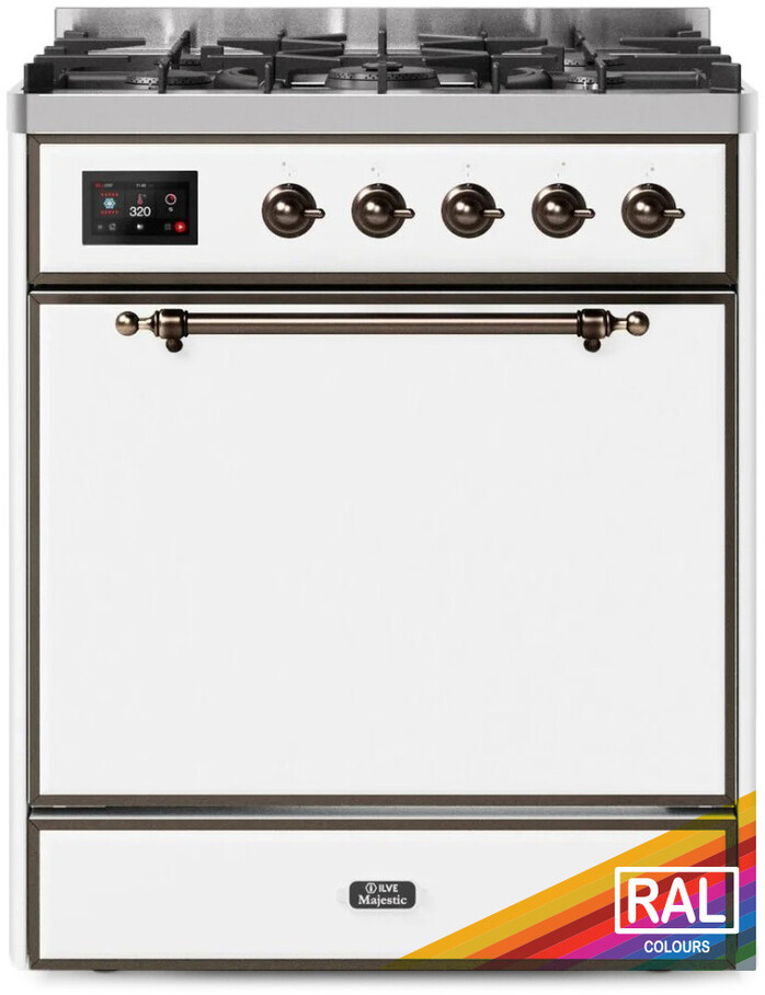 Freestanding Dual Fuel Range with 5 Sealed Burners, 4 cu. ft. Oven Capacity, Storage Drawer, and 4.3" Full Touch Display: RAL Color, Bronze Trim. Experience versatile cooking with five sealed burners, designed for easy cleaning and optimal heat distribution. With a spacious 4 cubic feet oven, you can easily prepare large meals and multiple dishes simultaneously. Conveniently store your cookware and kitchen essentials in the built-in storage drawer. Thanks to TFT technology, the display offers superior readability with clear graphics. Control all functions of one or two ovens by touching the large display. Adjust the temperature, set the timer, and program cooking start and end times-all with a sin. The grease does not stick to the surface and can therefore be cleaned more easily. The door hinges are fitted with a shock absorber that makes the closure more gradual and noiseless. Optimal supply and perfect distribution of the heat, for all types of cooking. The noble technical characteristics of brass are enriched with a nanotechnological coating that assures easy cleaning, with an elegant Total Black finish. The indestructible cast iron pan supports provide a functional and safe support for the pots. The electronic control ensures that the temperature of the oven remains constant throughout, without fluctuating, as is the case in conventional ovens. It can be set with precision starting from 85F, for perfect proofing, up to 575F, for roasting. An essential accessory to check the temperature at the core, for example in meat cuts. Thanks to this system, the vapors are removed from inside the cavity, allowing you to choose a drier or more moist cooking. This way, you can achieve a crispy baked dish or a soft and juicy roast. From proofing to cooking, roasting to low temperature, ILVE ovens allow you to prepare complex and sophisticated recipes very easily, with perfect results. With high-density insulation. Prevents the furniture next to the oven and the kitchen from overheating. Pizza function. Defrosting. Intensive cooking. Quick start. Moist intensive cooking. Fan grill cooking. Grill cooking with closed-door. Cooking from above. Moist cooking from above. Cooking from below. Moist cooking from below. Static normal cooking. Moist static normal cooking. Multiple fan cooking. Multiple moist fan cooking. ECO cooking. Burners/Elements: 5 Sealed Burner. Surface: Deep Recessed Cooktop. Control: Knobs on the Front Side. Grate Type: Cast Iron Grate. Burner 1: 2,000 BTU - 10,500 BTU (front left). Burner 2: 900 BTU - 20,000 BTU (center). Burner 3: 1,400 BTU - 7,000 BTU (front right). Burner 4: 1,400 BTU - 7,000 BTU (back left). Burner 5: 2,000 BTU - 10,500 BTU (back right). Fuel: Electric Oven. Convection: Yes. Control Type: 4.3" TFT Touch Screen on the Front Side. Cleaning Type: Easy Clean Enamel Cavity. Light(s): Yes. Rack Holders: Plain. Soft Close Door: Yes. Broiler: Yes. Child Safety Lock: Yes. Timer: Yes. Built-in Thermostat: Yes. Internal Thermometer: Yes. Range Hood: No. Power Cord: Yes. Grates: Yes. Griddle: No. Legs: No. Backsplash: Yes. Conversion Kit: Yes. Oven Racks: Yes. Oven Trays: Yes. Rotisserie: Yes. Gas Regulator: Yes. Manual: Yes. Voltage: 240 Volts. Amperage: 30 Amps. Hertz: 60 Hz. Width: 29 7/8". Depth: 27 1/4". Height: 36 1/4". Product Weight: 350 lbs. Warranty: 2 Years Limited Warranty.