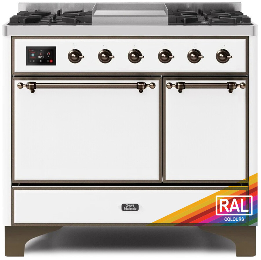 Freestanding Dual Fuel Range with 6 Sealed Burners, 3.82 cu. ft. Total Capacity, Warming Drawer, and Griddle: RAL Color, Bronze Trim. A true kitchen centerpiece that will demand attention, these exceptional bespoke ranges will complement any kitchen. The unique style of the Majestic Series stands out above the rest. ILVE offers the ability to create a customized and individual look. Brass is a noble material that guarantees excellent durability and the non-stick nanotechnological coating facilitates easy cleaning. Efficient Gas Supply provides up to 20,000 BTU burner power. Simple 4.3" TFT full touch screen, with intuitive and straightforward graphics, provides easy commands for selecting thermostat, timer, and automatic programmer for cooking start and finish timers. Minimal temperature fluctuation for optimal cooking; temperature spikes, uniform cooking, energy saving. Temperature is adjustable from 85F for perfect leavening. Continuous cast-iron grates let you slide pots easily on and off heat, or from one burner to another. ILVE freestanding cookers have a sealed oven cavity that traps moisture in the oven cavity ensuring that your meats remain moist and succulent! This also assists in less meat shrinkage while cooking. Built with AISI 304 steel and 12/10 thickness, choose your ideal combination between a gas burner cooktop or induction, mixed configuration, and various setups. The grease does not stick to the surface and can be cleaned more easily. An essential accessory to check the temperature at the core, for example in meat cuts. Thanks to this system, the vapors are removed from inside the cavity, allowing you to choose a drier or more moist cooking. This way, you can achieve a crispy baked dish or a soft and juicy roast. Pizza function. Defrosting. Intensive cooking. Quick start. Moist intensive cooking. Fan grill cooking. Grill cooking with closed-door. Cooking from above. Moist cooking from above. Cooking from below. Moist cooking from below. Static normal cooking. Moist static normal cooking. Multiple fan cooking. Multiple moist fan cooking. ECO cooking. Grill cooking with closed-door. Cooking from above. Cooking from below. Static normal cooking. ECO cooking. Fuel Type: Natural Gas / Liquid Propane. Burners/Elements: 6 Sealed Burner. Surface: Deep Recessed Cooktop. Control: Knobs on the Front Side. Grate Type: Cast Iron Grate. Fuel: Electric Oven. Door Type: Removable Solid Door. Convection: Yes. Control Type: 4.3" TFT Touch Screen on the Front Side. Cleaning Type: Easy Clean Enamel Cavity. Light(s): Yes. Rack Holders: Plain. Soft Close Door: Yes. Broiler: Yes. Child Safety Lock: Yes. Timer: Yes. Built-in Thermostat: Yes. Internal Thermometer: Yes. Range Hood: No. Power Cord: Yes. Grates: Yes. Griddle: Yes. Legs: Yes. Backsplash: Yes. Conversion Kit: Yes. Oven Racks: Yes. Oven Trays: Yes. Rotisserie: Yes. Gas Regulator: Yes. Manual: Yes. Voltage: 240 V. Amperage: 30 A. Hertz: 60 Hz. Power Cord Type: Hard Wire - 4-wire. Power Cord Length: 45 11/16". Width: 39 3/8". Depth: 27 1/4". Height: 36". Warranty: 2 Years Limited.