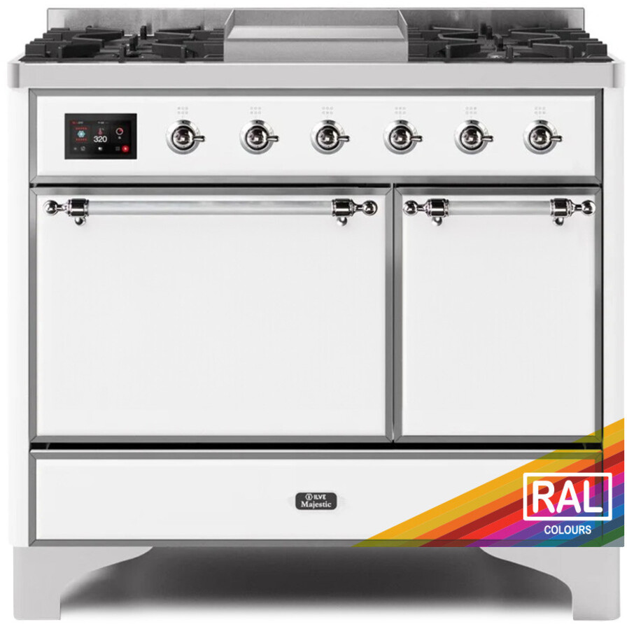 Freestanding Dual Fuel Range with 6 Sealed Burners, 3.82 cu. ft. Total Capacity, Warming Drawer, and Griddle: RAL Color, Chrome Trim. A true kitchen centerpiece that will demand attention, these exceptional bespoke ranges will complement any kitchen. The unique style of the Majestic Series stands out above the rest. ILVE offers the ability to create a customized and individual look. Brass is a noble material that guarantees excellent durability and the non-stick nanotechnological coating facilitates easy cleaning. Efficient Gas Supply provides up to 20,000 BTU burner power. Simple 4.3" TFT full touch screen, with intuitive and straightforward graphics, provides easy commands for selecting thermostat, timer, and automatic programmer for cooking start and finish timers. Minimal temperature fluctuation for optimal cooking; temperature spikes, uniform cooking, energy saving. Temperature is adjustable from 85F for perfect leavening. Continuous cast-iron grates let you slide pots easily on and off heat, or from one burner to another. ILVE freestanding cookers have a sealed oven cavity that traps moisture in the oven cavity ensuring that your meats remain moist and succulent! This also assists in less meat shrinkage while cooking. Built with AISI 304 steel and 12/10 thickness, choose your ideal combination between a gas burner cooktop or induction, mixed configuration, and various setups. The grease does not stick to the surface and can be cleaned more easily. An essential accessory to check the temperature at the core, for example in meat cuts. Thanks to this system, the vapors are removed from inside the cavity, allowing you to choose a drier or more moist cooking. This way, you can achieve a crispy baked dish or a soft and juicy roast. Pizza function. Defrosting. Intensive cooking. Quick start. Moist intensive cooking. Fan grill cooking. Grill cooking with closed-door. Cooking from above. Moist cooking from above. Cooking from below. Moist cooking from below. Static normal cooking. Moist static normal cooking. Multiple fan cooking. Multiple moist fan cooking. ECO cooking. Grill cooking with closed-door. Cooking from above. Cooking from below. Static normal cooking. ECO cooking. Fuel Type: Natural Gas / Liquid Propane. Burners/Elements: 6 Sealed Burner. Surface: Deep Recessed Cooktop. Control: Knobs on the Front Side. Grate Type: Cast Iron Grate. Fuel: Electric Oven. Door Type: Removable Solid Door. Convection: Yes. Control Type: 4.3" TFT Touch Screen on the Front Side. Cleaning Type: Easy Clean Enamel Cavity. Light(s): Yes. Rack Holders: Plain. Soft Close Door: Yes. Broiler: Yes. Child Safety Lock: Yes. Timer: Yes. Built-in Thermostat: Yes. Internal Thermometer: Yes. Range Hood: No. Power Cord: Yes. Grates: Yes. Griddle: Yes. Legs: Yes. Backsplash: Yes. Conversion Kit: Yes. Oven Racks: Yes. Oven Trays: Yes. Rotisserie: Yes. Gas Regulator: Yes. Manual: Yes. Voltage: 240 V. Amperage: 30 A. Hertz: 60 Hz. Power Cord Type: Hard Wire - 4-wire. Power Cord Length: 45 11/16". Width: 39 6/16". Overall Depth without Handles: 27 9/16". Overall Depth with Handles: 29 12/16". Overall Height without Backsplash: 35 10/16". Overall Height with Backsplash: 35 15/16". Shipping Dimensions: 40 5/16" W x 35 2/16" H x 33 4/16" D. Range Weight: 410 lbs. Shipping Weight: 430 lbs. Warranty: 2 Years Limited.