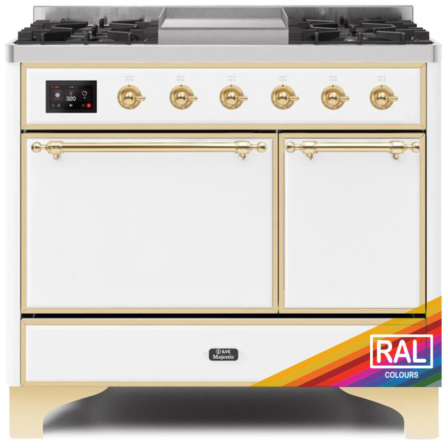 Freestanding Dual Fuel Range with 6 Sealed Burners, 3.82 cu. ft. Total Capacity, Warming Drawer, and Griddle: RAL Color, Brass Trim. A true kitchen centerpiece that will demand attention, these exceptional bespoke ranges will complement any kitchen. The unique style of the Majestic Series stands out above the rest. ILVE offers the ability to create a customized and individual look. Brass is a noble material that guarantees excellent durability and the non-stick nanotechnological coating facilitates easy cleaning. Efficient Gas Supply provides up to 20,000 BTU burner power. Simple 4.3" TFT full touch screen, with intuitive and straightforward graphics, provides easy commands for selecting thermostat, timer, and automatic programmer for cooking start and finish timers. Minimal temperature fluctuation for optimal cooking; temperature spikes, uniform cooking, energy saving. Temperature is adjustable from 85F for perfect leavening. Continuous cast-iron grates let you slide pots easily on and off heat, or from one burner to another. ILVE freestanding cookers have a sealed oven cavity that traps moisture in the oven cavity ensuring that your meats remain moist and succulent! This also assists in less meat shrinkage while cooking. Built with AISI 304 steel and 12/10 thickness, choose your ideal combination between a gas burner cooktop or induction, mixed configuration, and various setups. The grease does not stick to the surface and can be cleaned more easily. An essential accessory to check the temperature at the core, for example in meat cuts. Thanks to this system, the vapors are removed from inside the cavity, allowing you to choose a drier or more moist cooking. This way, you can achieve a crispy baked dish or a soft and juicy roast. Pizza function. Defrosting. Intensive cooking. Quick start. Moist intensive cooking. Fan grill cooking. Grill cooking with closed-door. Cooking from above. Moist cooking from above. Cooking from below. Moist cooking from below. Static normal cooking. Moist static normal cooking. Multiple fan cooking. Multiple moist fan cooking. ECO cooking. Grill cooking with closed-door. Cooking from above. Cooking from below. Static normal cooking. ECO cooking. Fuel Type: Natural Gas / Liquid Propane. Burners/Elements: 6 Sealed Burner. Surface: Deep Recessed Cooktop. Control: Knobs on the Front Side. Grate Type: Cast Iron Grate. Fuel: Electric Oven. Door Type: Removable Solid Door. Convection: Yes. Control Type: 4.3" TFT Touch Screen on the Front Side. Cleaning Type: Easy Clean Enamel Cavity. Light(s): Yes. Rack Holders: Plain. Soft Close Door: Yes. Broiler: Yes. Child Safety Lock: Yes. Timer: Yes. Built-in Thermostat: Yes. Internal Thermometer: Yes. Range Hood: No. Power Cord: Yes. Grates: Yes. Griddle: Yes. Legs: Yes. Backsplash: Yes. Conversion Kit: Yes. Oven Racks: Yes. Oven Trays: Yes. Rotisserie: Yes. Gas Regulator: Yes. Manual: Yes. Voltage: 240 V. Amperage: 30 A. Hertz: 60 Hz. Width: 39 3/8". Depth: 27 1/4". Height: 36". Warranty: 2 Years Limited.