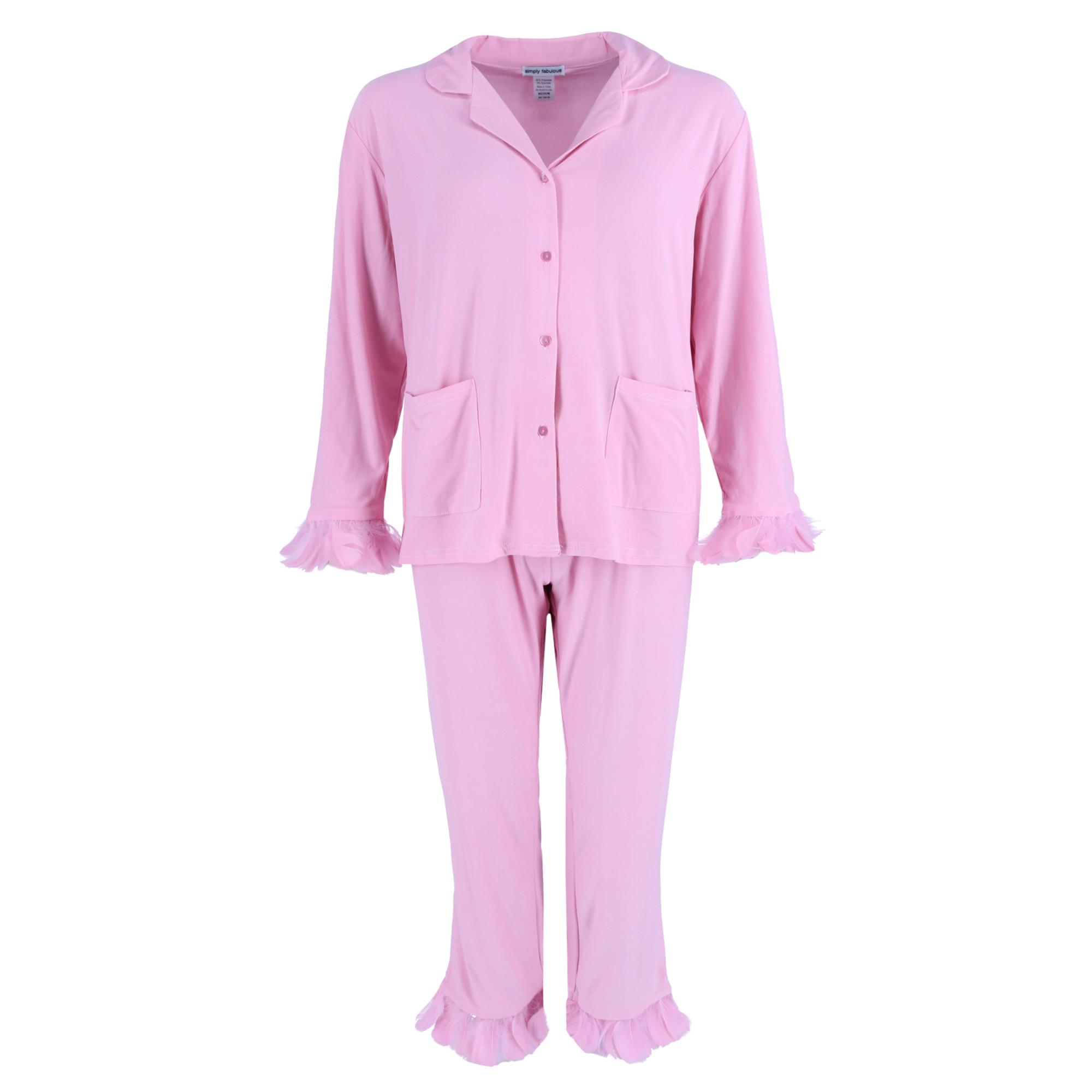 This pajama set is adorable with its light pink feminine color and the fun feather detailing. It is a classic collared button-down pajama top with long sleeves and two front pockets. The pants are open bottom with an elastic waistband and decorative bow. The fabric is very soft and comfortable and lightweight. This would be a great gift. Available in plus sizes Super soft and stretchy fabric for comfort. Feather detail at cuffs of sleeves and pants. Collared button-down long sleeve with open bottom pants. Light pink color is very feminine. Two front pockets on the sleep shirt.