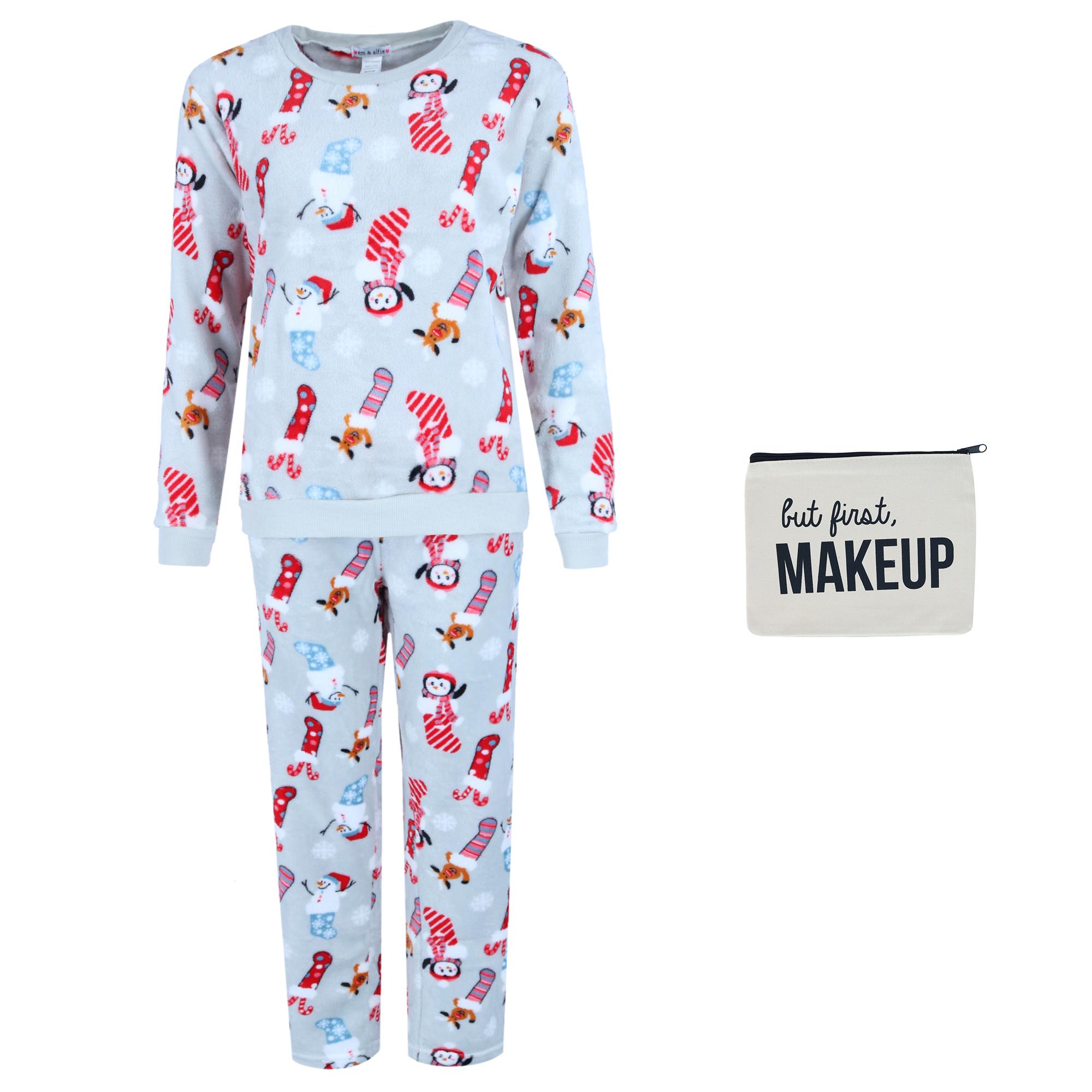 This holiday themed three-piece pajama set would make a great gift for the woman in your life. The fabric is very cozy for the cold winter months. It includes a crew neck style long sleeve with open bottom pants. The red bow detail is adorable and adds design to the pull-on elastic waistband pants. Festive pattern includes reindeer snowmen penguins candy canes stockings and snowflakes Three-piece PJ set perfect for holiday gifting. Adorable winter pattern for the holiday season. Super soft and warm fabric for extra comfort. Make up bag makes this very giftable. Crewneck style top with open bottom pant.
