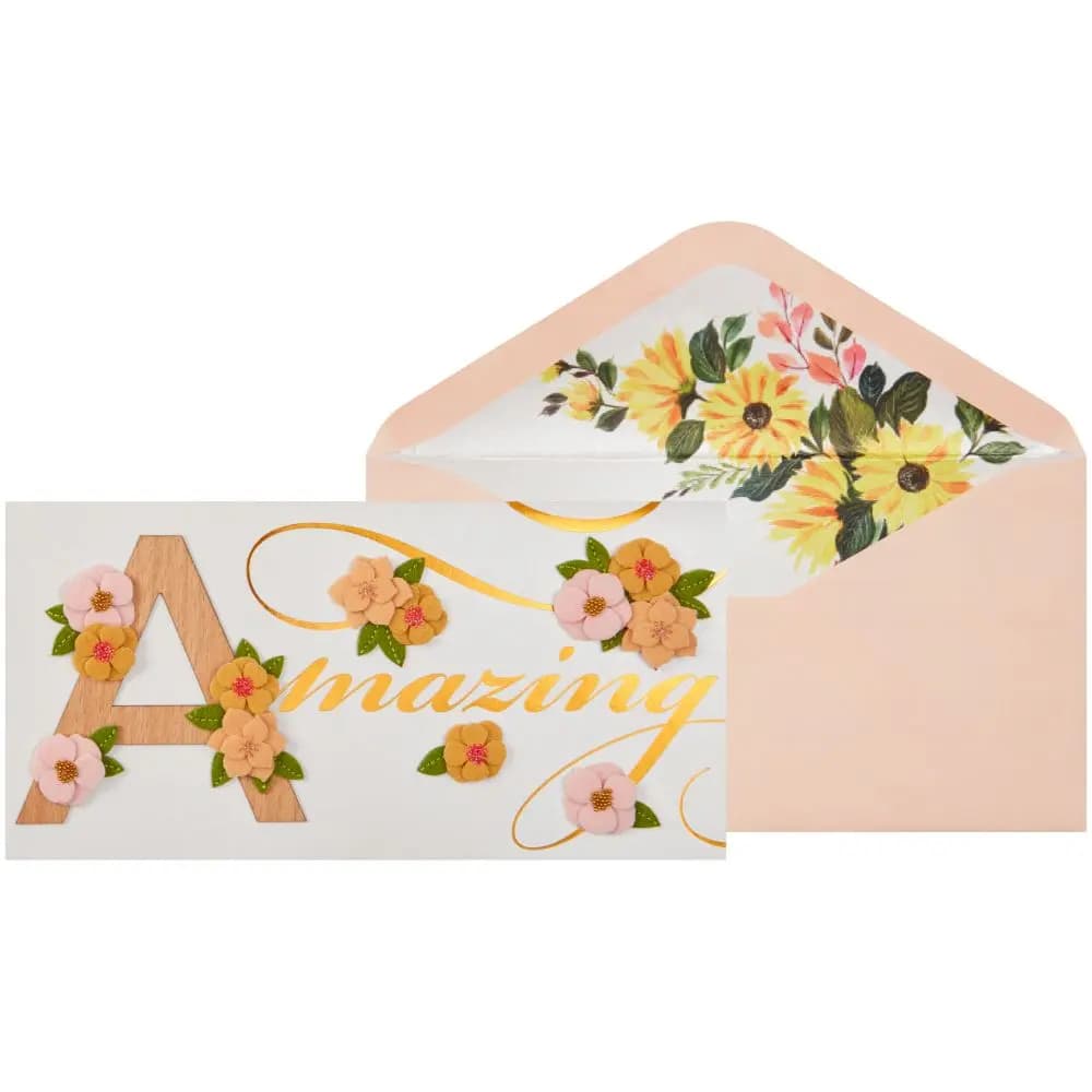 When you want to make your loved one feel truly special, there is no better gift than the Amazing Lettering Birthday Card by NIQUEA.D. This stunning card is sure to wow with its bold statement of ?Amazing? written on the front along with elegant embellishments like laser cut wood, felt flowers, beads and foil. Open the card up to reveal a beautiful sentiment inside ?On this special day, let?s celebrate the wonderful person that?s You!? It's an unforgettable way to say happy birthday and show them just how much they mean to you. For any occasion that calls for a unique celebration, start and end with the Amazing Lettering Birthday Card! Occasion: BirthdayMeasures: 7.25 X 3.625Embellishment: Laser Cut Wood, Felt Flowers, Beads, FoilSentiment: On this special day, let's celebrate the wonderful person that's You.