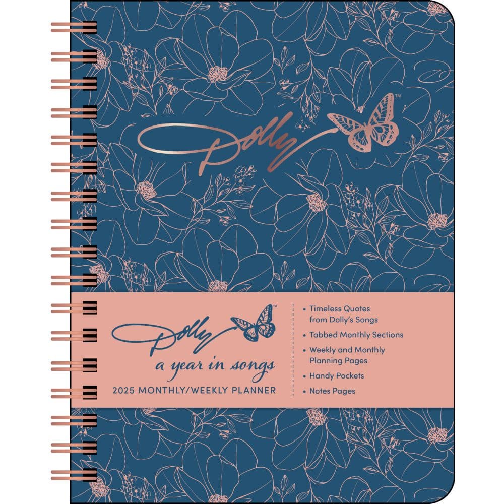 Organize your year with style and inspiration using the Dolly Parton 2025 Engagement Planner. This beautifully designed planner features a soft, ultra-feminine floral motif accented with rose-gold iridescent foil, making it a fashionable and functional choice for fans of Dolly and meticulous planners alike. Ideal for tracking appointments, reminders, and special dates, this planner is a must-have for anyone who loves to stay organized while being inspired by Dolly Parton's timeless wisdom and charm. Elegant rose-gold iridescent foil enhances the floral cover design, adding a touch of glamour to your daily planning Convenient size of 7" x 9" when closed, expanding to 14" x 9" when open, perfect for both portability and easy viewing Durable spiral binding allows the planner to lay flat for ease of use, while an elastic band keeps it securely closed when not in use Includes weekly and monthly planning pages, generous grid space for detailed notes, and reinforced monthly tabs for quick referencing Special features include a year-at-a-glance for 2024, 2025, and 2026, two storage pockets, official major world holidays, moon phases, and timeless quotes from Dolly's songs Enhance your planning with the Dolly Parton 2025 Engagement Planner and keep your year on track with inspiration at every page turn. Perfect for personal use or as a thoughtful gift for the Dolly Parton fan in your life. Order now and make 2025 a year of organized success and musical inspiration!.