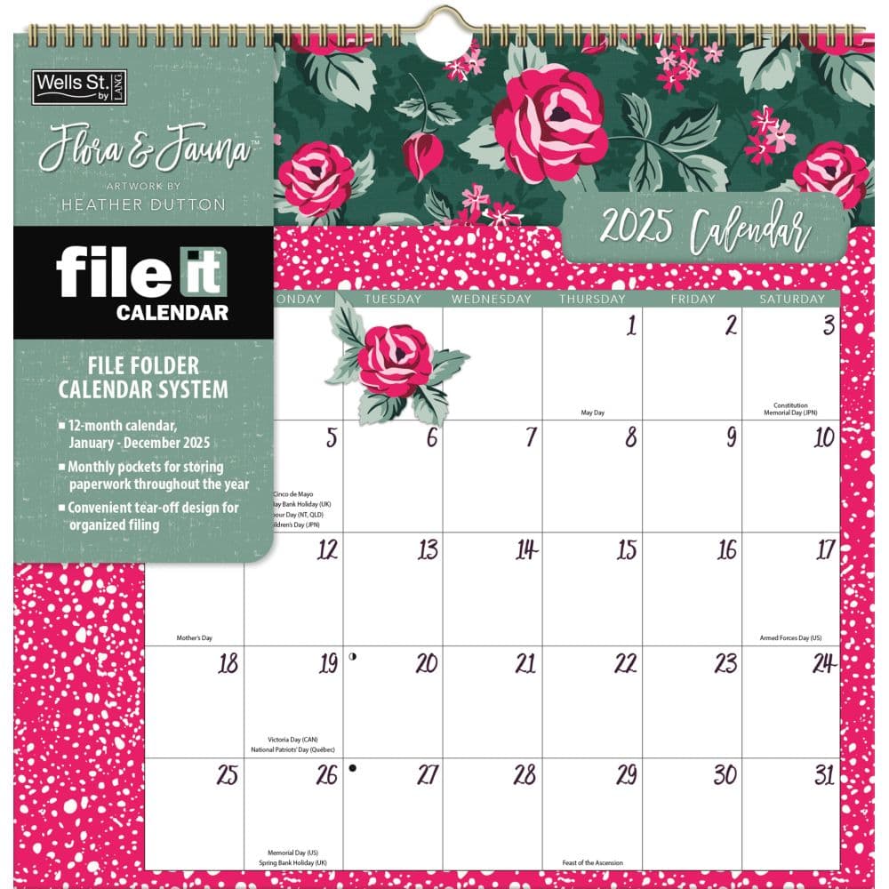 Stay organized and inspired throughout 2025 with the 2025 Flora Fauna File-It Wall Calendar by Heather Dutton. This unique calendar not only beautifies your space with vibrant floral and fauna artwork by Heather Dutton but also doubles as an innovative filing system. Each month features a detachable file folder, allowing you to neatly store documents, notes, and receipts. The spacious grid layout provides ample room for jotting down appointments and reminders, making it the perfect organizational tool for home or office. Size Closed: 12" x 12"; Size Open: 12" x 12" Features Wire-O binding for easy flipping and hanging Includes a notes section on each folder for labeling and organizing contents Each month displays a unique, beautifully illustrated design Made with high-quality materials and designed to be used throughout the year The Flora and Fauna File-It Calendar is not just a tool for organization; it's a piece of art that brings a touch of nature's beauty into your daily routine. The calendar starts in January 2025 and covers a 12-month period, ideal for planning throughout the year. It includes major U.S. holidays and has moon phases noted, ensuring you never miss an important date. Enhance your planning and organization with a touch of artistic flair. Order the 2025 Flora Fauna File-It Wall Calendar by Heather Dutton today and transform your approach to staying organized!.
