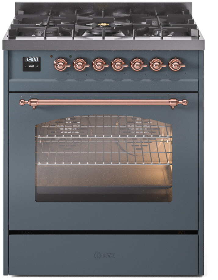 Freestanding Dual Fuel Range with 5 Sealed Burners, 4 cu. ft. Oven Capacity, Storage Drawer, and Quick Start: Blue Grey, Copper Trim - NG. Enjoy versatile cooking with five sealed burners, offering precise control and easy cleanup for all your culinary needs. Cook multiple dishes simultaneously with the spacious 4 cubic feet oven capacity, perfect for hosting family gatherings and dinner parties. Keep your kitchen organized with a convenient storage drawer, ideal for storing pots, pans, and baking sheets. Reach your desired temperature quickly with the quick preheating function, then choose the best cooking mode suited for your dish. It also works as rapid defrosting when a low temperature is set (85F - 105F). The grease does not stick to the surface and can be cleaned more easily. The door hinges are fitted with a shock absorber that makes the closure more gradual and noiseless. With power up to btu 25000 as standard. Supplies optimal and perfect distribution of the flame, for all types of cooking. The ideal power for perfect cooking, always. The noble technical characteristics of brass are enriched with a nanotechnological coating that assures easy cleaning, with an elegant black finish. The noble technical characteristics of brass are enriched with a nanotechnological coating that assures easy cleaning, with an elegant black finish. The highly durable, cast iron pan grates provide functional and safe support for all sorts of pots and pans. Ensure the oven temperature remains constant throughout, without fluctuating, as is the case in conventional ovens. Set at 85F for perfect proofing, or up to 575F for roasting. Reach your desired temperature quickly with the quick preheating function, then choose the best cooking mode suited for your dish. It also works as rapid defrosting when a low temperature is set (85F - 105F). Suitable for baking pizza, but also bread and focaccia. The main source of heat is the lower heating element which, with the help of the other underpowered heating elements, creates an ideal situation for this type of cooking. The quick oven preheating function allows it to reach the desired temperature in a short time and you can then choose the best-suited cooking mode for the dish. It also works as quick defrosting when a low temperature is set (85F - 105F). This is the function that allows different dishes to be cooked simultaneously without the smells mixing. Lasagna, croissants and brioches, tarts, cakes, etc. can be baked, thereby saving time and electricity. It assures quick and intensive cooking with steam discharge. It is recommended to obtain a crispy result: baked potatoes and vegetables, chicken, salt-crusted fish, etc. Particularly fast and deep, with significant energy savings, this function is suitable for many foods, such as pork chop, sausages, pork or mixed kebabs, game, Roman-style gnocchi, etc. Recommended function for quick and deep grilling, browning, and roasting meat in general, fillet, Florentine steak, fish, and even vegetables. Particularly suitable for browning and adding the final touch of color to many foods; it is the recommended function for burgers, pork chops, veal steaks, sole, cuttlefish, etc. This is the most suitable cooking method to complete the cooking cycle, especially pastries (biscuits, meringues, leavened desserts, fruit desserts, etc.). This is the classic function of the electric oven, particularly suitable for cooking the following foods: pork chop, sausages, salt cod, braised meat, game, roast veal, meringues and biscuits, baked fruit, etc. Style: Freestanding. Cooktop: Sealed Burner. Drawer: Storage. Fuel Type: Dual Fuel. Continuous Grates: Yes. Digital Clock: Yes. Burners: 5. Cooktop Control Type: Knobs. Downdraft Ventilation: No. Griddle: No. Grill: No. Cast Iron Grates: Yes. French Top: No. Simmer Burner: Yes. Highest Burner Output: 25000 BTU. Front Left Output: 10500. Back Left Output: 7000. Back Right Output: 10500. Front Right Output: 7000. Middle Center Output: 25000. Total Capacity: 4 cu. ft. Steam-Clean: No. Broiler: Yes. Sabbath Mode: No. Self-Cleaning: No. Convection: Yes. Digital Temperature Display: Yes. Oven Control Type: Digital. Steam Oven: No. Double Oven: No. Temperature Probe: No. Interior Oven Light: Yes. Handle Shape: Tubular. Handle Type: Bar. Handcrafted from Italy: Yes. High-End Workmanship: Yes. Cool Door with Triple Oven Glass: Yes. Total Black Nano-Tech Non-Stick Coated Burners: Yes. Rotisserie: Yes. Storage Drawer: Yes. Continuous Cast Iron Pan Support: Yes. Soft Close Door System: Yes. ETL: Yes. Volts: 240 V. Amps: 30 A. Width: 29 7/8". Depth: 26 1/2". Height: 38". Exterior Width: 30".