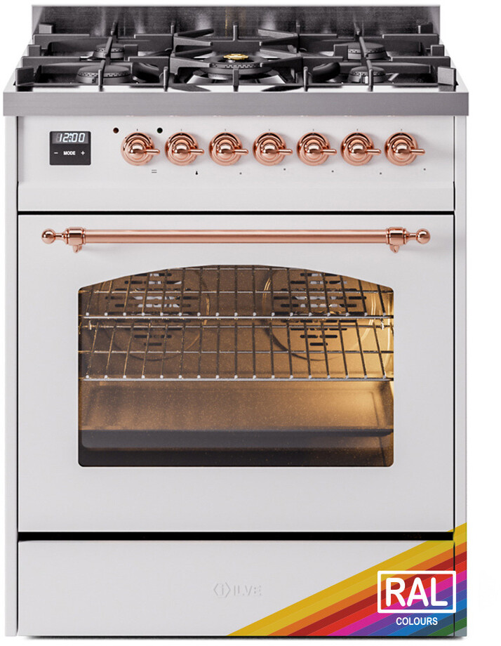 Freestanding Dual Fuel Range with 5 Sealed Burners, 4 cu. ft. Oven Capacity, Storage Drawer, and Quick Start: RAL Color, Copper Trim. Enjoy versatile cooking with five sealed burners, offering precise control and easy cleanup for all your culinary needs. Cook multiple dishes simultaneously with the spacious 4 cubic feet oven capacity, perfect for hosting family gatherings and dinner parties. Keep your kitchen organized with a convenient storage drawer, ideal for storing pots, pans, and baking sheets. Reach your desired temperature quickly with the quick preheating function, then choose the best cooking mode suited for your dish. It also works as rapid defrosting when a low temperature is set (85F - 105F). The grease does not stick to the surface and can be cleaned more easily. The door hinges are fitted with a shock absorber that makes the closure more gradual and noiseless. With power up to btu 25000 as standard. Supplies optimal and perfect distribution of the flame, for all types of cooking. The ideal power for perfect cooking, always. The noble technical characteristics of brass are enriched with a nanotechnological coating that assures easy cleaning, with an elegant black finish. The noble technical characteristics of brass are enriched with a nanotechnological coating that assures easy cleaning, with an elegant black finish. The highly durable, cast iron pan grates provide functional and safe support for all sorts of pots and pans. Ensure the oven temperature remains constant throughout, without fluctuating, as is the case in conventional ovens. Set at 85F for perfect proofing, or up to 575F for roasting. Reach your desired temperature quickly with the quick preheating function, then choose the best cooking mode suited for your dish. It also works as rapid defrosting when a low temperature is set (85F - 105F). Suitable for baking pizza, but also bread and focaccia. The main source of heat is the lower heating element which, with the help of the other underpowered heating elements, creates an ideal situation for this type of cooking. The quick oven preheating function allows it to reach the desired temperature in a short time and you can then choose the best-suited cooking mode for the dish. It also works as quick defrosting when a low temperature is set (85F - 105F). This is the function that allows different dishes to be cooked simultaneously without the smells mixing. Lasagna, croissants and brioches, tarts, cakes, etc. can be baked, thereby saving time and electricity. It assures quick and intensive cooking with steam discharge. It is recommended to obtain a crispy result: baked potatoes and vegetables, chicken, salt-crusted fish, etc. Particularly fast and deep, with significant energy savings, this function is suitable for many foods, such as pork chop, sausages, pork or mixed kebabs, game, Roman-style gnocchi, etc. Recommended function for quick and deep grilling, browning, and roasting meat in general, fillet, Florentine steak, fish, and even vegetables. Particularly suitable for browning and adding the final touch of color to many foods; it is the recommended function for burgers, pork chops, veal steaks, sole, cuttlefish, etc. This is the most suitable cooking method to complete the cooking cycle, especially pastries (biscuits, meringues, leavened desserts, fruit desserts, etc.). This is the classic function of the electric oven, particularly suitable for cooking the following foods: pork chop, sausages, salt cod, braised meat, game, roast veal, meringues and biscuits, baked fruit, etc. Style: Freestanding. Cooktop: Sealed Burner. Drawer: Storage. Fuel Type: Dual Fuel. Continuous Grates: Yes. Digital Clock: Yes. Burners: 5. Cooktop Control Type: Knobs. Downdraft Ventilation: No. Griddle: No. Grill: No. Cast Iron Grates: Yes. French Top: No. Simmer Burner: Yes. Highest Burner Output: 25000 BTU. Front Left Output: 10500 BTU/h - 2000 BTU/h. Back Left Output: 7000 BTU/h - 1400 BTU/h. Back Right Output: 10500 BTU/h - 2000 BTU/h. Front Right Output: 7000 BTU/h - 1400 BTU/h. Middle Center Output: 25000 BTU/h - 900 BTU/h. Total Capacity: 4 cu. ft. Steam-Clean: No. Broiler: Yes. Sabbath Mode: No. Self-Cleaning: No. Convection: Yes. Digital Temperature Display: Yes. Oven Control Type: Digital. Steam Oven: No. Double Oven: No. Temperature Probe: No. Interior Oven Light: Yes. Handle Shape: Tubular. Handle Type: Bar. Handcrafted from Italy: Yes. High-End Workmanship: Yes. Cool Door with Triple Oven Glass: Yes. Total Black Nano-Tech Non-Stick Coated Burners: Yes. Rotisserie: Yes. Storage Drawer: Yes. Continuous Cast Iron Pan Support: Yes. Soft Close Door System: Yes. ETL: Yes. Volts: 240 V. Amps: 30 A. Width: 29 7/8". Depth: 25". Height: 35 3/4". Exterior Width: 30".