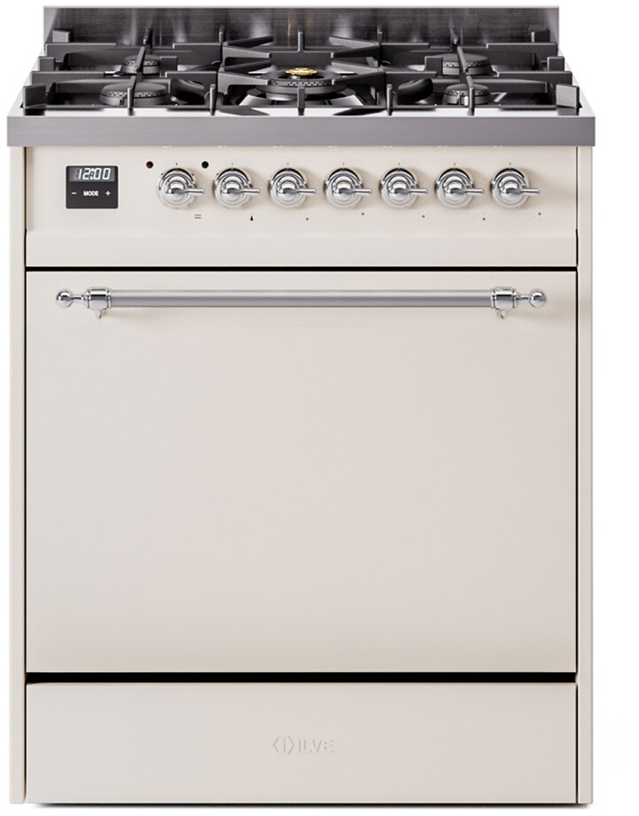 Freestanding Dual Fuel Range with 5 Sealed Burners, 4 cu. ft. Oven Capacity, Storage Drawer, Continuous Grates, and Quick Start: Antique White, Chrome Trim. Enjoy versatile cooking with five sealed burners, offering precise control and easy cleanup for all your culinary needs. Cook multiple dishes simultaneously with the spacious 4 cubic feet oven capacity, perfect for hosting family gatherings and dinner parties. Keep your kitchen organized with a convenient storage drawer, ideal for storing pots, pans, and baking sheets. Reach your desired temperature quickly with the quick preheating function, then choose the best cooking mode suited for your dish. It also works as rapid defrosting when a low temperature is set (85F - 105F). The grease does not stick to the surface and can be cleaned more easily. The door hinges are fitted with a shock absorber that makes the closure more gradual and noiseless. With power up to btu 25000 as standard. Supplies optimal and perfect distribution of the flame, for all types of cooking. The ideal power for perfect cooking, always. The noble technical characteristics of brass are enriched with a nanotechnological coating that assures easy cleaning, with an elegant black finish. The noble technical characteristics of brass are enriched with a nanotechnological coating that assures easy cleaning, with an elegant black finish. The highly durable, cast iron pan grates provide functional and safe support for all sorts of pots and pans. Ensure the oven temperature remains constant throughout, without fluctuating, as is the case in conventional ovens. Set at 85F for perfect proofing, or up to 575F for roasting. Reach your desired temperature quickly with the quick preheating function, then choose the best cooking mode suited for your dish. It also works as rapid defrosting when a low temperature is set (85F - 105F). Suitable for baking pizza, but also bread and focaccia. The main source of heat is the lower heating element which, with the help of the other underpowered heating elements, creates an ideal situation for this type of cooking. The quick oven preheating function allows it to reach the desired temperature in a short time and you can then choose the best-suited cooking mode for the dish. It also works as quick defrosting when a low temperature is set (85F - 105F). This is the function that allows different dishes to be cooked simultaneously without the smells mixing. Lasagna, croissants and brioches, tarts, cakes, etc. can be baked, thereby saving time and electricity. It assures quick and intensive cooking with steam discharge. It is recommended to obtain a crispy result: baked potatoes and vegetables, chicken, salt-crusted fish, etc. Particularly fast and deep, with significant energy savings, this function is suitable for many foods, such as pork chop, sausages, pork or mixed kebabs, game, Roman-style gnocchi, etc. Recommended function for quick and deep grilling, browning, and roasting meat in general, fillet, Florentine steak, fish, and even vegetables. Particularly suitable for browning and adding the final touch of color to many foods; it is the recommended function for burgers, pork chops, veal steaks, sole, cuttlefish, etc. This is the most suitable cooking method to complete the cooking cycle, especially pastries (biscuits, meringues, leavened desserts, fruit desserts, etc.). This is the classic function of the electric oven, particularly suitable for cooking the following foods: pork chop, sausages, salt cod, braised meat, game, roast veal, meringues and biscuits, baked fruit, etc. Series: Nostalgie II. Fuel Type: Dual Fuel. Gas Type: Natural Gas. Installation Type: Freestanding. Sabbath Mode: No. Number of Racks: 2. Drawer Type: Storage Drawer. Display Type: LCD Display. Timer: Yes. Cooking Probe: Yes. Rotisserie: Yes. Soft Close Door: Yes. Cooktop Configuration: 5 Sealed Burners. Burner/Element Type: Sealed Burner. Number of Burners/Elements: 5. Griddle: No. Grill: No. French Top: No. Burner/Element Output 1: 10500 BTU/h - 2000 BTU/h. Burner/Element Output 2: 25000 BTU/h - 900 BTU/h. Burner/Element Output 3: 7000 BTU/h - 1400 BTU/h. Burner/Element Output 4: 7000 BTU/h - 1400 BTU/h. Burner/Element Output 5: 10500 BTU/h - 2000 BTU/h. Oven Control Type: Knobs. Oven Door Type: Solid Door. Number of Ovens: Single Oven. Main Oven Capacity (cu. ft.): 4. Oven Cleaning Type: Easy Clean Enamel Cavities. Main Oven Type: UOV 76 M. Voltage: 240 V. Amps: 15.4 A. ADA Compliant: No. Star-K Certified: No. Width: 29 7/8". Depth: 25". Height: 35 3/4". Exterior Width: 30". Parts and Labor: 2 Years.