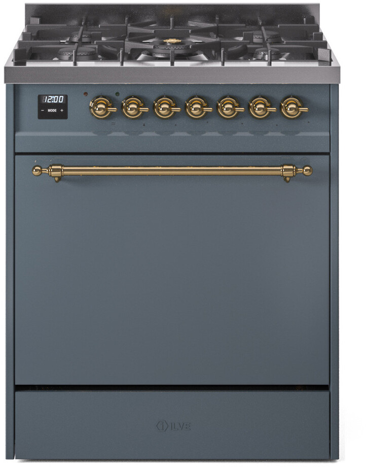 Freestanding Dual Fuel Range with 5 Sealed Burners, 4 cu. ft. Oven Capacity, Storage Drawer, Continuous Grates, and Quick Start: Blue Grey, Brass Trim. Enjoy versatile cooking with five sealed burners, offering precise control and easy cleanup for all your culinary needs. Cook multiple dishes simultaneously with the spacious 4 cubic feet oven capacity, perfect for hosting family gatherings and dinner parties. Keep your kitchen organized with a convenient storage drawer, ideal for storing pots, pans, and baking sheets. Reach your desired temperature quickly with the quick preheating function, then choose the best cooking mode suited for your dish. It also works as rapid defrosting when a low temperature is set (85F - 105F). The grease does not stick to the surface and can be cleaned more easily. The door hinges are fitted with a shock absorber that makes the closure more gradual and noiseless. With power up to btu 25000 as standard. Supplies optimal and perfect distribution of the flame, for all types of cooking. The ideal power for perfect cooking, always. The noble technical characteristics of brass are enriched with a nanotechnological coating that assures easy cleaning, with an elegant black finish. The noble technical characteristics of brass are enriched with a nanotechnological coating that assures easy cleaning, with an elegant black finish. The highly durable, cast iron pan grates provide functional and safe support for all sorts of pots and pans. Ensure the oven temperature remains constant throughout, without fluctuating, as is the case in conventional ovens. Set at 85F for perfect proofing, or up to 575F for roasting. Reach your desired temperature quickly with the quick preheating function, then choose the best cooking mode suited for your dish. It also works as rapid defrosting when a low temperature is set (85F - 105F). Suitable for baking pizza, but also bread and focaccia. The main source of heat is the lower heating element which, with the help of the other underpowered heating elements, creates an ideal situation for this type of cooking. The quick oven preheating function allows it to reach the desired temperature in a short time and you can then choose the best-suited cooking mode for the dish. It also works as quick defrosting when a low temperature is set (85F - 105F). This is the function that allows different dishes to be cooked simultaneously without the smells mixing. Lasagna, croissants and brioches, tarts, cakes, etc. can be baked, thereby saving time and electricity. It assures quick and intensive cooking with steam discharge. It is recommended to obtain a crispy result: baked potatoes and vegetables, chicken, salt-crusted fish, etc. Particularly fast and deep, with significant energy savings, this function is suitable for many foods, such as pork chop, sausages, pork or mixed kebabs, game, Roman-style gnocchi, etc. Recommended function for quick and deep grilling, browning, and roasting meat in general, fillet, Florentine steak, fish, and even vegetables. Particularly suitable for browning and adding the final touch of color to many foods; it is the recommended function for burgers, pork chops, veal steaks, sole, cuttlefish, etc. This is the most suitable cooking method to complete the cooking cycle, especially pastries (biscuits, meringues, leavened desserts, fruit desserts, etc.). This is the classic function of the electric oven, particularly suitable for cooking the following foods: pork chop, sausages, salt cod, braised meat, game, roast veal, meringues and biscuits, baked fruit, etc. Series: Nostalgie II. Fuel Type: Dual Fuel. Gas Type: Natural Gas. Installation Type: Freestanding. Sabbath Mode: No. Number of Racks: 2. Drawer Type: Storage Drawer. Display Type: LCD Display. Timer: Yes. Cooking Probe: Yes. Rotisserie: Yes. Soft Close Door: Yes. Cooktop Configuration: 5 Sealed Burners. Burner/Element Type: Sealed Burner. Number of Burners/Elements: 5. Griddle: No. Grill: No. French Top: No. Burner/Element Output 1: 10500 BTU/h - 2000 BTU/h. Burner/Element Output 2: 25000 BTU/h - 900 BTU/h. Burner/Element Output 3: 7000 BTU/h - 1400 BTU/h. Burner/Element Output 4: 7000 BTU/h - 1400 BTU/h. Burner/Element Output 5: 10500 BTU/h - 2000 BTU/h. Oven Control Type: Knobs. Oven Door Type: Solid Door. Number of Ovens: Single Oven. Main Oven Capacity (cu. ft.): 4. Oven Cleaning Type: Easy Clean Enamel Cavities. Main Oven Type: UOV 76 M. Voltage: 240 V. Amps: 15.4 A. ADA Compliant: No. Star-K Certified: No. Width: 29 7/8". Depth: 25". Height: 35 3/4". Exterior Width: 30". Parts and Labor: 2 Years.