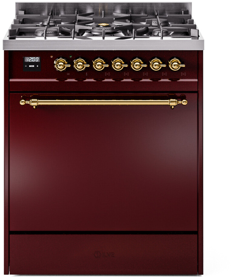 Freestanding Dual Fuel Range with 5 Sealed Burners, 4 cu. ft. Oven Capacity, Storage Drawer, Continuous Grates, and Quick Start: Burgundy, Brass Trim. Enjoy versatile cooking with five sealed burners, offering precise control and easy cleanup for all your culinary needs. Cook multiple dishes simultaneously with the spacious 4 cubic feet oven capacity, perfect for hosting family gatherings and dinner parties. Keep your kitchen organized with a convenient storage drawer, ideal for storing pots, pans, and baking sheets. Reach your desired temperature quickly with the quick preheating function, then choose the best cooking mode suited for your dish. It also works as rapid defrosting when a low temperature is set (85F - 105F). The grease does not stick to the surface and can be cleaned more easily. The door hinges are fitted with a shock absorber that makes the closure more gradual and noiseless. With power up to btu 25000 as standard. Supplies optimal and perfect distribution of the flame, for all types of cooking. The ideal power for perfect cooking, always. The noble technical characteristics of brass are enriched with a nanotechnological coating that assures easy cleaning, with an elegant black finish. The noble technical characteristics of brass are enriched with a nanotechnological coating that assures easy cleaning, with an elegant black finish. The highly durable, cast iron pan grates provide functional and safe support for all sorts of pots and pans. Ensure the oven temperature remains constant throughout, without fluctuating, as is the case in conventional ovens. Set at 85F for perfect proofing, or up to 575F for roasting. Reach your desired temperature quickly with the quick preheating function, then choose the best cooking mode suited for your dish. It also works as rapid defrosting when a low temperature is set (85F - 105F). Suitable for baking pizza, but also bread and focaccia. The main source of heat is the lower heating element which, with the help of the other underpowered heating elements, creates an ideal situation for this type of cooking. The quick oven preheating function allows it to reach the desired temperature in a short time and you can then choose the best-suited cooking mode for the dish. It also works as quick defrosting when a low temperature is set (85F - 105F). This is the function that allows different dishes to be cooked simultaneously without the smells mixing. Lasagna, croissants and brioches, tarts, cakes, etc. can be baked, thereby saving time and electricity. It assures quick and intensive cooking with steam discharge. It is recommended to obtain a crispy result: baked potatoes and vegetables, chicken, salt-crusted fish, etc. Particularly fast and deep, with significant energy savings, this function is suitable for many foods, such as pork chop, sausages, pork or mixed kebabs, game, Roman-style gnocchi, etc. Recommended function for quick and deep grilling, browning, and roasting meat in general, fillet, Florentine steak, fish, and even vegetables. Particularly suitable for browning and adding the final touch of color to many foods; it is the recommended function for burgers, pork chops, veal steaks, sole, cuttlefish, etc. This is the most suitable cooking method to complete the cooking cycle, especially pastries (biscuits, meringues, leavened desserts, fruit desserts, etc.). This is the classic function of the electric oven, particularly suitable for cooking the following foods: pork chop, sausages, salt cod, braised meat, game, roast veal, meringues and biscuits, baked fruit, etc. Series: Nostalgie II. Fuel Type: Dual Fuel. Gas Type: Natural Gas. Installation Type: Freestanding. Sabbath Mode: No. Number of Racks: 2. Drawer Type: Storage Drawer. Display Type: LCD Display. Timer: Yes. Cooking Probe: Yes. Rotisserie: Yes. Soft Close Door: Yes. Cooktop Configuration: 5 Sealed Burners. Burner/Element Type: Sealed Burner. Number of Burners/Elements: 5. Griddle: No. Grill: No. French Top: No. Burner/Element Output 1: 10500 BTU/h - 2000 BTU/h. Burner/Element Output 2: 25000 BTU/h - 900 BTU/h. Burner/Element Output 3: 7000 BTU/h - 1400 BTU/h. Burner/Element Output 4: 7000 BTU/h - 1400 BTU/h. Burner/Element Output 5: 10500 BTU/h - 2000 BTU/h. Oven Control Type: Knobs. Oven Door Type: Solid Door. Number of Ovens: Single Oven. Main Oven Capacity (cu. ft.): 4. Oven Cleaning Type: Easy Clean Enamel Cavities. Main Oven Type: UOV 76 M. Voltage: 240 V. Amps: 15.4 A. ADA Compliant: No. Star-K Certified: No. Width: 29 7/8". Depth: 25". Height: 35 3/4". Exterior Width: 30". Parts and Labor: 2 Years.