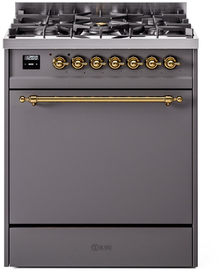 Freestanding Dual Fuel Range with 5 Sealed Burners, 4 cu. ft. Oven Capacity, Storage Drawer, Continuous Grates, and Quick Start: Graphite Matte, Brass Trim. Enjoy versatile cooking with five sealed burners, offering precise control and easy cleanup for all your culinary needs. Cook multiple dishes simultaneously with the spacious 4 cubic feet oven capacity, perfect for hosting family gatherings and dinner parties. Keep your kitchen organized with a convenient storage drawer, ideal for storing pots, pans, and baking sheets. Reach your desired temperature quickly with the quick preheating function, then choose the best cooking mode suited for your dish. It also works as rapid defrosting when a low temperature is set (85F - 105F). The grease does not stick to the surface and can be cleaned more easily. The door hinges are fitted with a shock absorber that makes the closure more gradual and noiseless. With power up to btu 25000 as standard. Supplies optimal and perfect distribution of the flame, for all types of cooking. The ideal power for perfect cooking, always. The noble technical characteristics of brass are enriched with a nanotechnological coating that assures easy cleaning, with an elegant black finish. The noble technical characteristics of brass are enriched with a nanotechnological coating that assures easy cleaning, with an elegant black finish. The highly durable, cast iron pan grates provide functional and safe support for all sorts of pots and pans. Ensure the oven temperature remains constant throughout, without fluctuating, as is the case in conventional ovens. Set at 85F for perfect proofing, or up to 575F for roasting. Reach your desired temperature quickly with the quick preheating function, then choose the best cooking mode suited for your dish. It also works as rapid defrosting when a low temperature is set (85F - 105F). Suitable for baking pizza, but also bread and focaccia. The main source of heat is the lower heating element which, with the help of the other underpowered heating elements, creates an ideal situation for this type of cooking. The quick oven preheating function allows it to reach the desired temperature in a short time and you can then choose the best-suited cooking mode for the dish. It also works as quick defrosting when a low temperature is set (85F - 105F). This is the function that allows different dishes to be cooked simultaneously without the smells mixing. Lasagna, croissants and brioches, tarts, cakes, etc. can be baked, thereby saving time and electricity. It assures quick and intensive cooking with steam discharge. It is recommended to obtain a crispy result: baked potatoes and vegetables, chicken, salt-crusted fish, etc. Particularly fast and deep, with significant energy savings, this function is suitable for many foods, such as pork chop, sausages, pork or mixed kebabs, game, Roman-style gnocchi, etc. Recommended function for quick and deep grilling, browning, and roasting meat in general, fillet, Florentine steak, fish, and even vegetables. Particularly suitable for browning and adding the final touch of color to many foods; it is the recommended function for burgers, pork chops, veal steaks, sole, cuttlefish, etc. This is the most suitable cooking method to complete the cooking cycle, especially pastries (biscuits, meringues, leavened desserts, fruit desserts, etc.). This is the classic function of the electric oven, particularly suitable for cooking the following foods: pork chop, sausages, salt cod, braised meat, game, roast veal, meringues and biscuits, baked fruit, etc. Series: Nostalgie II. Fuel Type: Dual Fuel. Gas Type: Natural Gas. Installation Type: Freestanding. Sabbath Mode: No. Number of Racks: 2. Drawer Type: Storage Drawer. Display Type: LCD Display. Timer: Yes. Cooking Probe: Yes. Rotisserie: Yes. Soft Close Door: Yes. Cooktop Configuration: 5 Sealed Burners. Burner/Element Type: Sealed Burner. Number of Burners/Elements: 5. Griddle: No. Grill: No. French Top: No. Burner/Element Output 1: 10500 BTU/h - 2000 BTU/h. Burner/Element Output 2: 25000 BTU/h - 900 BTU/h. Burner/Element Output 3: 7000 BTU/h - 1400 BTU/h. Burner/Element Output 4: 7000 BTU/h - 1400 BTU/h. Burner/Element Output 5: 10500 BTU/h - 2000 BTU/h. Oven Control Type: Knobs. Oven Door Type: Solid Door. Number of Ovens: Single Oven. Main Oven Capacity (cu. ft.): 4. Oven Cleaning Type: Easy Clean Enamel Cavities. Main Oven Type: UOV 76 M. Voltage: 240 V. Amps: 15.4 A. ADA Compliant: No. Star-K Certified: No. Width: 29 7/8". Depth: 25". Height: 35 3/4". Exterior Width: 30". Parts and Labor: 2 Years.