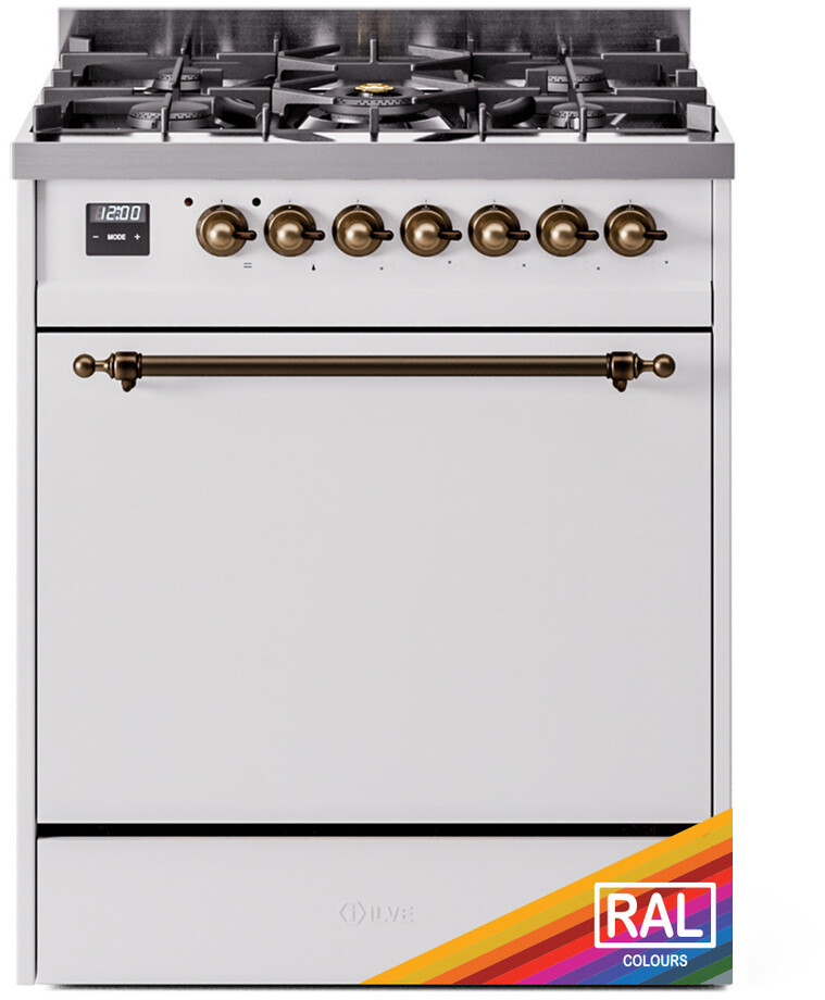 Freestanding Dual Fuel Range with 5 Sealed Burners, 4 cu. ft. Oven Capacity, Storage Drawer, Continuous Grates, and Quick Start: RAL Color, Bronze Trim. Enjoy versatile cooking with five sealed burners, offering precise control and easy cleanup for all your culinary needs. Cook multiple dishes simultaneously with the spacious 4 cubic feet oven capacity, perfect for hosting family gatherings and dinner parties. Keep your kitchen organized with a convenient storage drawer, ideal for storing pots, pans, and baking sheets. Reach your desired temperature quickly with the quick preheating function, then choose the best cooking mode suited for your dish. It also works as rapid defrosting when a low temperature is set (85F - 105F). The grease does not stick to the surface and can be cleaned more easily. The door hinges are fitted with a shock absorber that makes the closure more gradual and noiseless. With power up to btu 25000 as standard. Supplies optimal and perfect distribution of the flame, for all types of cooking. The ideal power for perfect cooking, always. The noble technical characteristics of brass are enriched with a nanotechnological coating that assures easy cleaning, with an elegant black finish. The noble technical characteristics of brass are enriched with a nanotechnological coating that assures easy cleaning, with an elegant black finish. The highly durable, cast iron pan grates provide functional and safe support for all sorts of pots and pans. Ensure the oven temperature remains constant throughout, without fluctuating, as is the case in conventional ovens. Set at 85F for perfect proofing, or up to 575F for roasting. Reach your desired temperature quickly with the quick preheating function, then choose the best cooking mode suited for your dish. It also works as rapid defrosting when a low temperature is set (85F - 105F). Suitable for baking pizza, but also bread and focaccia. The main source of heat is the lower heating element which, with the help of the other underpowered heating elements, creates an ideal situation for this type of cooking. The quick oven preheating function allows it to reach the desired temperature in a short time and you can then choose the best-suited cooking mode for the dish. It also works as quick defrosting when a low temperature is set (85F - 105F). This is the function that allows different dishes to be cooked simultaneously without the smells mixing. Lasagna, croissants and brioches, tarts, cakes, etc. can be baked, thereby saving time and electricity. It assures quick and intensive cooking with steam discharge. It is recommended to obtain a crispy result: baked potatoes and vegetables, chicken, salt-crusted fish, etc. Particularly fast and deep, with significant energy savings, this function is suitable for many foods, such as pork chop, sausages, pork or mixed kebabs, game, Roman-style gnocchi, etc. Recommended function for quick and deep grilling, browning, and roasting meat in general, fillet, Florentine steak, fish, and even vegetables. Particularly suitable for browning and adding the final touch of color to many foods; it is the recommended function for burgers, pork chops, veal steaks, sole, cuttlefish, etc. This is the most suitable cooking method to complete the cooking cycle, especially pastries (biscuits, meringues, leavened desserts, fruit desserts, etc.). This is the classic function of the electric oven, particularly suitable for cooking the following foods: pork chop, sausages, salt cod, braised meat, game, roast veal, meringues and biscuits, baked fruit, etc. Series: Nostalgie II. Fuel Type: Dual Fuel. Gas Type: Natural Gas. Installation Type: Freestanding. Sabbath Mode: No. Number of Racks: 2. Drawer Type: Storage Drawer. Display Type: LCD Display. Timer: Yes. Cooking Probe: Yes. Rotisserie: Yes. Soft Close Door: Yes. Cooktop Configuration: 5 Sealed Burners. Burner/Element Type: Sealed Burner. Number of Burners/Elements: 5. Griddle: No. Grill: No. French Top: No. Burner/Element Output 1: 10500 BTU/h - 2000 BTU/h. Burner/Element Output 2: 25000 BTU/h - 900 BTU/h. Burner/Element Output 3: 7000 BTU/h - 1400 BTU/h. Burner/Element Output 4: 7000 BTU/h - 1400 BTU/h. Burner/Element Output 5: 10500 BTU/h - 2000 BTU/h. Oven Control Type: Knobs. Oven Door Type: Solid Door. Number of Ovens: Single Oven. Main Oven Capacity (cu. ft.): 4. Oven Cleaning Type: Easy Clean Enamel Cavities. Main Oven Type: UOV 76 M. Voltage: 240 V. Amps: 15.4 A. ADA Compliant: No. Star-K Certified: No. Width: 29 7/8". Depth: 25". Height: 35 3/4". Exterior Width: 30". Parts and Labor: 2 Years.