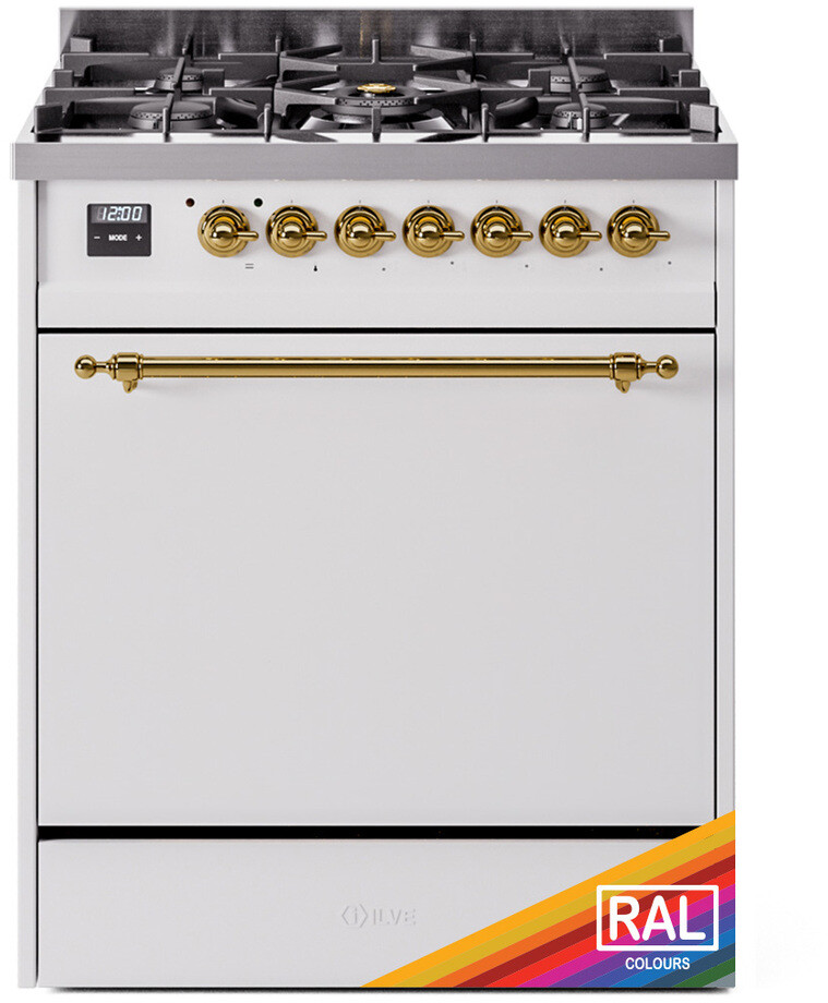 Freestanding Dual Fuel Range with 5 Sealed Burners, 4 cu. ft. Oven Capacity, Storage Drawer, Continuous Grates, and Quick Start: RAL Color, Brass Trim. Enjoy versatile cooking with five sealed burners, offering precise control and easy cleanup for all your culinary needs. Cook multiple dishes simultaneously with the spacious 4 cubic feet oven capacity, perfect for hosting family gatherings and dinner parties. Keep your kitchen organized with a convenient storage drawer, ideal for storing pots, pans, and baking sheets. Reach your desired temperature quickly with the quick preheating function, then choose the best cooking mode suited for your dish. It also works as rapid defrosting when a low temperature is set (85F - 105F). The grease does not stick to the surface and can be cleaned more easily. The door hinges are fitted with a shock absorber that makes the closure more gradual and noiseless. With power up to btu 25000 as standard. Supplies optimal and perfect distribution of the flame, for all types of cooking. The ideal power for perfect cooking, always. The noble technical characteristics of brass are enriched with a nanotechnological coating that assures easy cleaning, with an elegant black finish. The noble technical characteristics of brass are enriched with a nanotechnological coating that assures easy cleaning, with an elegant black finish. The highly durable, cast iron pan grates provide functional and safe support for all sorts of pots and pans. Ensure the oven temperature remains constant throughout, without fluctuating, as is the case in conventional ovens. Set at 85F for perfect proofing, or up to 575F for roasting. Reach your desired temperature quickly with the quick preheating function, then choose the best cooking mode suited for your dish. It also works as rapid defrosting when a low temperature is set (85F - 105F). Suitable for baking pizza, but also bread and focaccia. The main source of heat is the lower heating element which, with the help of the other underpowered heating elements, creates an ideal situation for this type of cooking. The quick oven preheating function allows it to reach the desired temperature in a short time and you can then choose the best-suited cooking mode for the dish. It also works as quick defrosting when a low temperature is set (85F - 105F). This is the function that allows different dishes to be cooked simultaneously without the smells mixing. Lasagna, croissants and brioches, tarts, cakes, etc. can be baked, thereby saving time and electricity. It assures quick and intensive cooking with steam discharge. It is recommended to obtain a crispy result: baked potatoes and vegetables, chicken, salt-crusted fish, etc. Particularly fast and deep, with significant energy savings, this function is suitable for many foods, such as pork chop, sausages, pork or mixed kebabs, game, Roman-style gnocchi, etc. Recommended function for quick and deep grilling, browning, and roasting meat in general, fillet, Florentine steak, fish, and even vegetables. Particularly suitable for browning and adding the final touch of color to many foods; it is the recommended function for burgers, pork chops, veal steaks, sole, cuttlefish, etc. This is the most suitable cooking method to complete the cooking cycle, especially pastries (biscuits, meringues, leavened desserts, fruit desserts, etc.). This is the classic function of the electric oven, particularly suitable for cooking the following foods: pork chop, sausages, salt cod, braised meat, game, roast veal, meringues and biscuits, baked fruit, etc. Series: Nostalgie II. Fuel Type: Dual Fuel. Gas Type: Natural Gas. Installation Type: Freestanding. Sabbath Mode: No. Number of Racks: 2. Drawer Type: Storage Drawer. Display Type: LCD Display. Timer: Yes. Cooking Probe: Yes. Rotisserie: Yes. Soft Close Door: Yes. Cooktop Configuration: 5 Sealed Burners. Burner/Element Type: Sealed Burner. Number of Burners/Elements: 5. Griddle: No. Grill: No. French Top: No. Burner/Element Output 1: 10500 BTU/h - 2000 BTU/h. Burner/Element Output 2: 25000 BTU/h - 900 BTU/h. Burner/Element Output 3: 7000 BTU/h - 1400 BTU/h. Burner/Element Output 4: 7000 BTU/h - 1400 BTU/h. Burner/Element Output 5: 10500 BTU/h - 2000 BTU/h. Oven Control Type: Knobs. Oven Door Type: Solid Door. Number of Ovens: Single Oven. Main Oven Capacity (cu. ft.): 4. Oven Cleaning Type: Easy Clean Enamel Cavities. Main Oven Type: UOV 76 M. Voltage: 240 V. Amps: 15.4 A. ADA Compliant: No. Star-K Certified: No. Width: 29 7/8". Depth: 25". Height: 35 3/4". Exterior Width: 30". Parts and Labor: 2 Years.