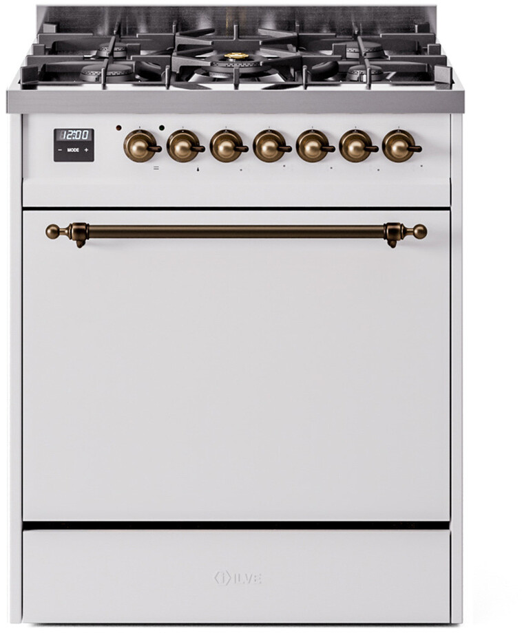 Freestanding Dual Fuel Range with 5 Sealed Burners, 4 cu. ft. Oven Capacity, Storage Drawer, Continuous Grates, and Quick Start: White, Bronze Trim. Enjoy versatile cooking with five sealed burners, offering precise control and easy cleanup for all your culinary needs. Cook multiple dishes simultaneously with the spacious 4 cubic feet oven capacity, perfect for hosting family gatherings and dinner parties. Keep your kitchen organized with a convenient storage drawer, ideal for storing pots, pans, and baking sheets. Reach your desired temperature quickly with the quick preheating function, then choose the best cooking mode suited for your dish. It also works as rapid defrosting when a low temperature is set (85F - 105F). The grease does not stick to the surface and can be cleaned more easily. The door hinges are fitted with a shock absorber that makes the closure more gradual and noiseless. With power up to btu 25000 as standard. Supplies optimal and perfect distribution of the flame, for all types of cooking. The ideal power for perfect cooking, always. The noble technical characteristics of brass are enriched with a nanotechnological coating that assures easy cleaning, with an elegant black finish. The noble technical characteristics of brass are enriched with a nanotechnological coating that assures easy cleaning, with an elegant black finish. The highly durable, cast iron pan grates provide functional and safe support for all sorts of pots and pans. Ensure the oven temperature remains constant throughout, without fluctuating, as is the case in conventional ovens. Set at 85F for perfect proofing, or up to 575F for roasting. Reach your desired temperature quickly with the quick preheating function, then choose the best cooking mode suited for your dish. It also works as rapid defrosting when a low temperature is set (85F - 105F). Suitable for baking pizza, but also bread and focaccia. The main source of heat is the lower heating element which, with the help of the other underpowered heating elements, creates an ideal situation for this type of cooking. The quick oven preheating function allows it to reach the desired temperature in a short time and you can then choose the best-suited cooking mode for the dish. It also works as quick defrosting when a low temperature is set (85F - 105F). This is the function that allows different dishes to be cooked simultaneously without the smells mixing. Lasagna, croissants and brioches, tarts, cakes, etc. can be baked, thereby saving time and electricity. It assures quick and intensive cooking with steam discharge. It is recommended to obtain a crispy result: baked potatoes and vegetables, chicken, salt-crusted fish, etc. Particularly fast and deep, with significant energy savings, this function is suitable for many foods, such as pork chop, sausages, pork or mixed kebabs, game, Roman-style gnocchi, etc. Recommended function for quick and deep grilling, browning, and roasting meat in general, fillet, Florentine steak, fish, and even vegetables. Particularly suitable for browning and adding the final touch of color to many foods; it is the recommended function for burgers, pork chops, veal steaks, sole, cuttlefish, etc. This is the most suitable cooking method to complete the cooking cycle, especially pastries (biscuits, meringues, leavened desserts, fruit desserts, etc.). This is the classic function of the electric oven, particularly suitable for cooking the following foods: pork chop, sausages, salt cod, braised meat, game, roast veal, meringues and biscuits, baked fruit, etc. Series: Nostalgie II. Fuel Type: Dual Fuel. Gas Type: Natural Gas. Installation Type: Freestanding. Sabbath Mode: No. Number of Racks: 2. Drawer Type: Storage Drawer. Display Type: LCD Display. Timer: Yes. Cooking Probe: Yes. Rotisserie: Yes. Soft Close Door: Yes. Cooktop Configuration: 5 Sealed Burners. Burner/Element Type: Sealed Burner. Number of Burners/Elements: 5. Griddle: No. Grill: No. French Top: No. Burner/Element Output 1: 10500 BTU/h - 2000 BTU/h. Burner/Element Output 2: 25000 BTU/h - 900 BTU/h. Burner/Element Output 3: 7000 BTU/h - 1400 BTU/h. Burner/Element Output 4: 7000 BTU/h - 1400 BTU/h. Burner/Element Output 5: 10500 BTU/h - 2000 BTU/h. Oven Control Type: Knobs. Oven Door Type: Solid Door. Number of Ovens: Single Oven. Main Oven Capacity (cu. ft.): 4. Oven Cleaning Type: Easy Clean Enamel Cavities. Main Oven Type: UOV 76 M. Voltage: 240 V. Amps: 15.4 A. ADA Compliant: No. Star-K Certified: No. Width: 29 7/8". Depth: 25". Height: 35 3/4". Exterior Width: 30". Parts and Labor: 2 Years.