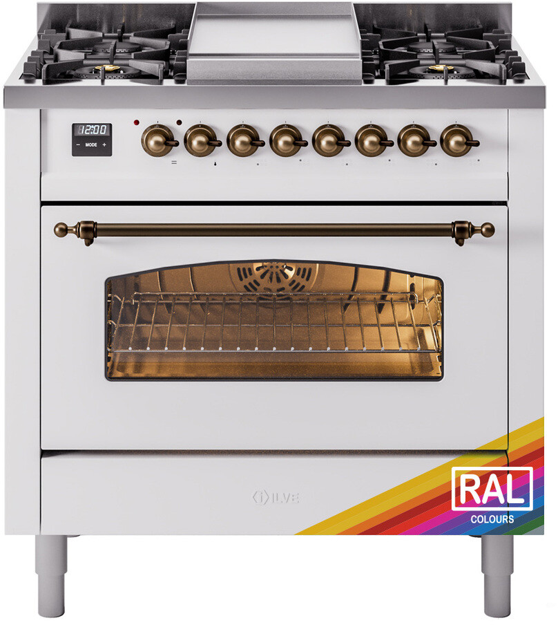 Freestanding Dual Fuel Range with 6 Sealed Burners, 3.5 cu. ft. Oven Capacity, Storage Drawer, Quick Start, Soft Closing Door and Griddle: RAL Color, Bronze Trim. Enjoy versatile cooking with six sealed burners, offering precise control and easy cleanup for all your culinary needs. Cook multiple dishes simultaneously with the spacious 3.5 cubic feet oven capacity, perfect for hosting family gatherings and dinner parties. Keep your kitchen organized with a convenient storage drawer, ideal for storing pots, pans, and baking sheets. Enjoy added versatility with the built-in griddle, perfect for making pancakes, grilled sandwiches, and more. The quick oven preheating function allows it to reach the desired temperature in a short time and you can then choose the best-suited cooking mode for the dish. It also works as rapid defrosting when a low temperature is set (85F - 105F). The electronic control ensures that the temperature of the oven remains constant throughout, without fluctuating, as is the case in conventional ovens. It can be set with precision starting from 85F, for perfect proofing, up to 575F, for roasting. The door hinges are fitted with a shock absorber that makes the closure more gradual and noiseless. With power up to 25000 btu as standard. Optimal supply and perfect distribution of the heat, for all types of cooking. With non-stick nanotechnological treatment. The noble technical characteristics of brass are enriched with a nanotechnological coating that assures easy cleaning, with an elegant Total Black finish. Structure in AISI 304 steel with 12/10 thickness, option to choose the ideal combination between a gas hob with up to 9 burners or induction, mixed and in various setups. The indestructible cast iron pan supports provide a functional and safe support for the pots. Pizza function. Quick start. Multiple fan cooking. Intensive cooking. Fan grill cooking. Grill cooking with closed-door. Cooking from above. Cooking from below. Static normal cooking. Series: Nostalgie II. Fuel Type: Dual Fuel. Gas Type: Natural Gas. Installation Type: Freestanding. Sabbath Mode: No. Number of Racks: 2. Drawer Type: Storage Drawer. Display Type: LCD Display. Timer: Yes. Cooking Probe: Yes. Rotisserie: Yes. Soft Close Door: Yes. Cooktop Configuration: 6 Sealed Burners + Griddle. Burner/Element Type: Sealed Burner. Number of Burners/Elements: 6. Griddle: Yes. Grill: No. French Top: No. Burner Output 1: 25000 BTU/h - 900 BTU/h. Burner Output 2: 7000 BTU/h - 1400 BTU/h. Burner Output 3: 25000 BTU/h - 900 BTU/h. Burner Output 4: 10500 BTU/h - 2000 BTU/h. Burner Output 5: 10500 BTU/h - 2000 BTU/h. Burner Output 6: 10500 BTU/h - 2000 BTU/h. Oven Control Type: Knobs. Oven Door Type: Triple Glass Door. Number of Ovens: Single Oven. Main Oven Capacity (cu. ft.): 3.5. Oven Cleaning Type: Easy Clean Enamel Cavities. Main Oven Type: UOV 80 M. Voltage: 240 V. Amps: 15.4 A. ADA Compliant: No. Star-K Certified: No. Width: 35 3/4". Depth: 25". Height: 38 1/2". Exterior Width: 36".