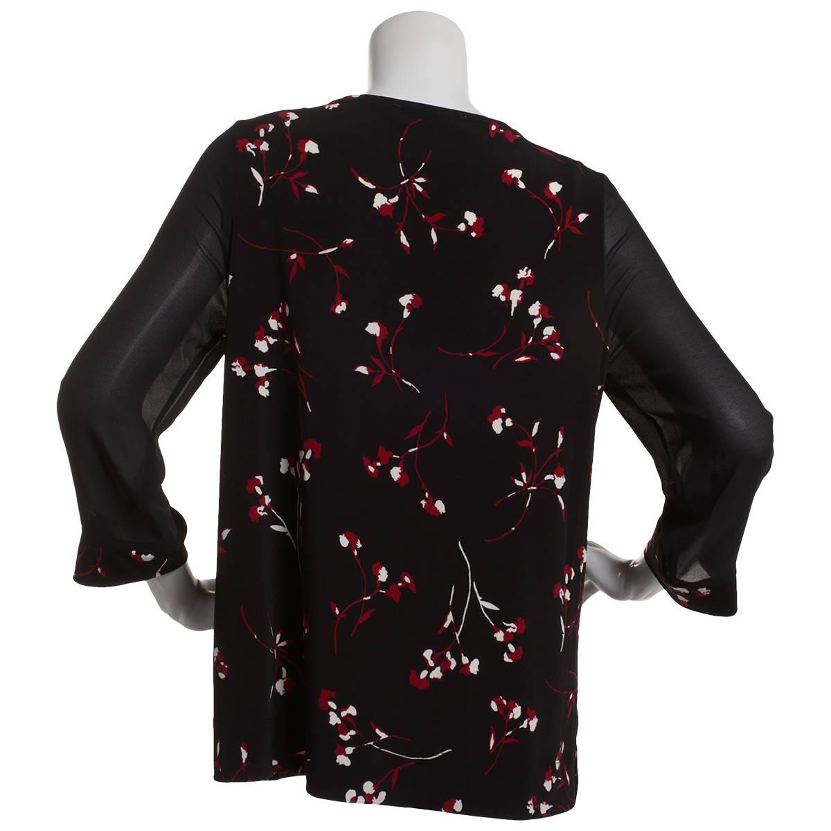 Pattern: Floral Sleeve Length: 3/4 Sleeve Neck: Round Neck Sheer sleeve feature Banded cuffs & hem Split side seams Linear hem Cool iron.