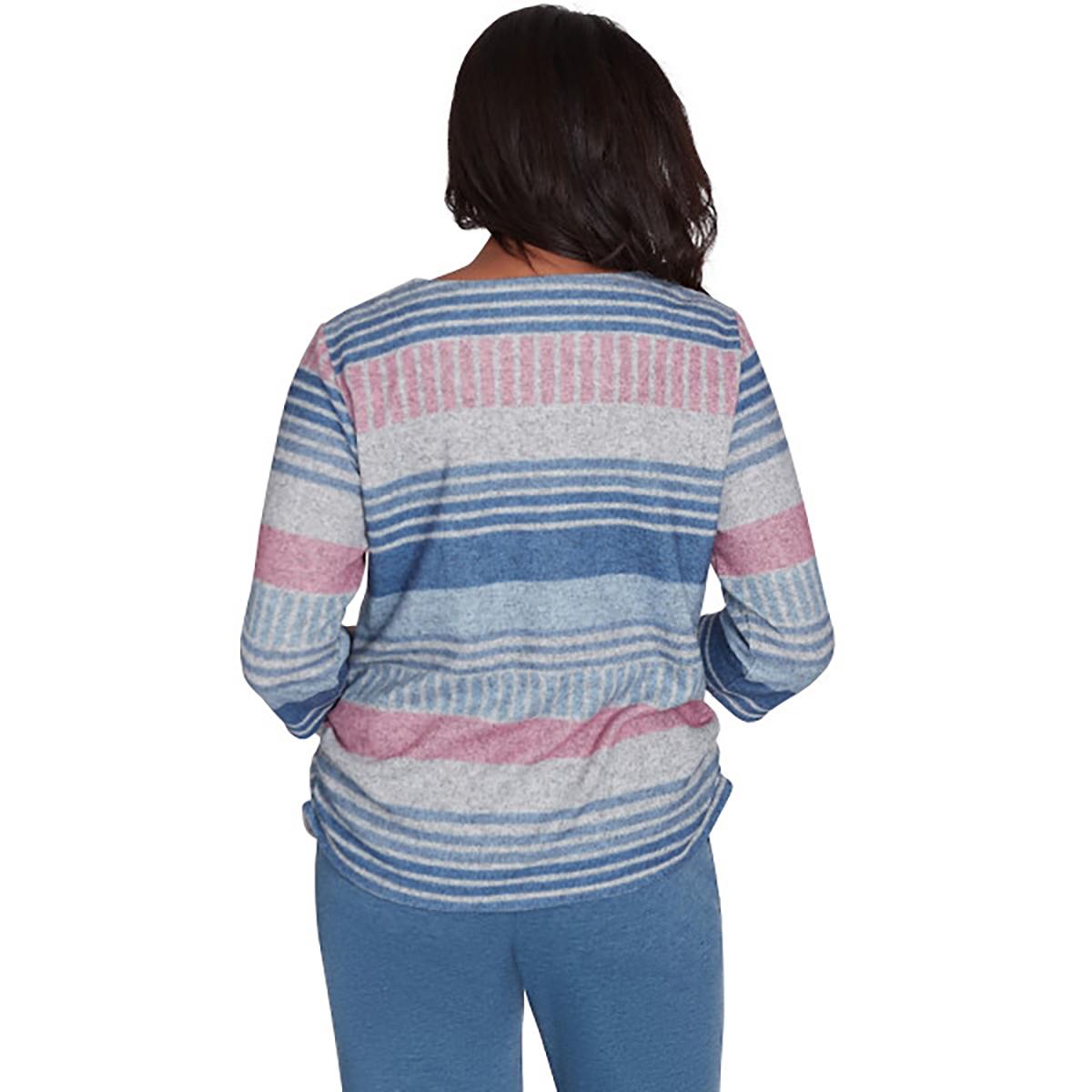 Collection: Casual Fridays Pattern: Stripe Sleeve Length: 3/4 Sleeve Neck: Round Neck Ruched side seams Linear hemline Cool iron.