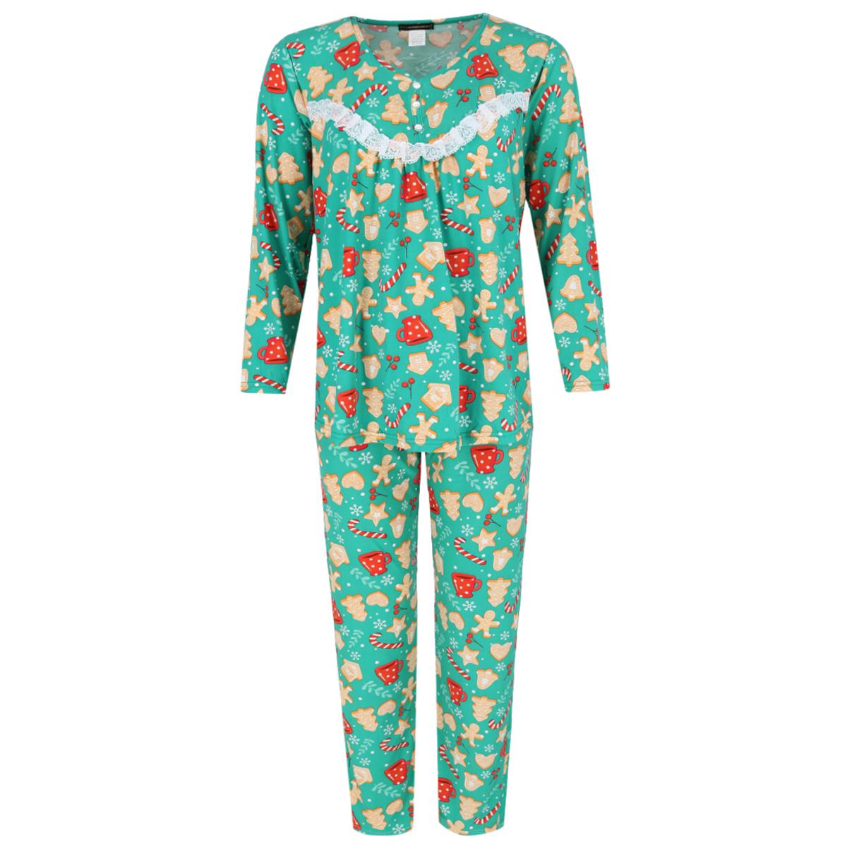 This matching pajama set is so festive and fun. The fabric of this set is stretchy and a buttery soft material for maximum comfort all night. The print is adorable and very festive for the holidays with the cut-out cookies hot cocoa candy canes and snowflakes. The green and red colors are also perfect festive colors for the holiday season and you cannot go wrong. The faux henley long sleeve top matches the open bottom pajama pants to make a cute sleep set. You can wear this to sleep or cuddly up on the couch or by the fire watching your favorite holiday movie. The top features a feminine lace trim details and the pants have an elastic waistband and decorative bow. This set would make a great gift. Soft: The fabric of this pajama set is stretchy and buttery soft for maximum comfort all night. Festive: The print is adorable and very festive for the holidays with the cookies hot cocoa and candy canes. Bright: The green and red colors are also festive colors for the holiday season and you cannot go wrong. Matching: The faux henley long sleeve top matches the open bottom pajama pants to make a cute sleep set. Details: The top features a feminine lace trim detail and the pants have an elastic waistband and decorative bow.