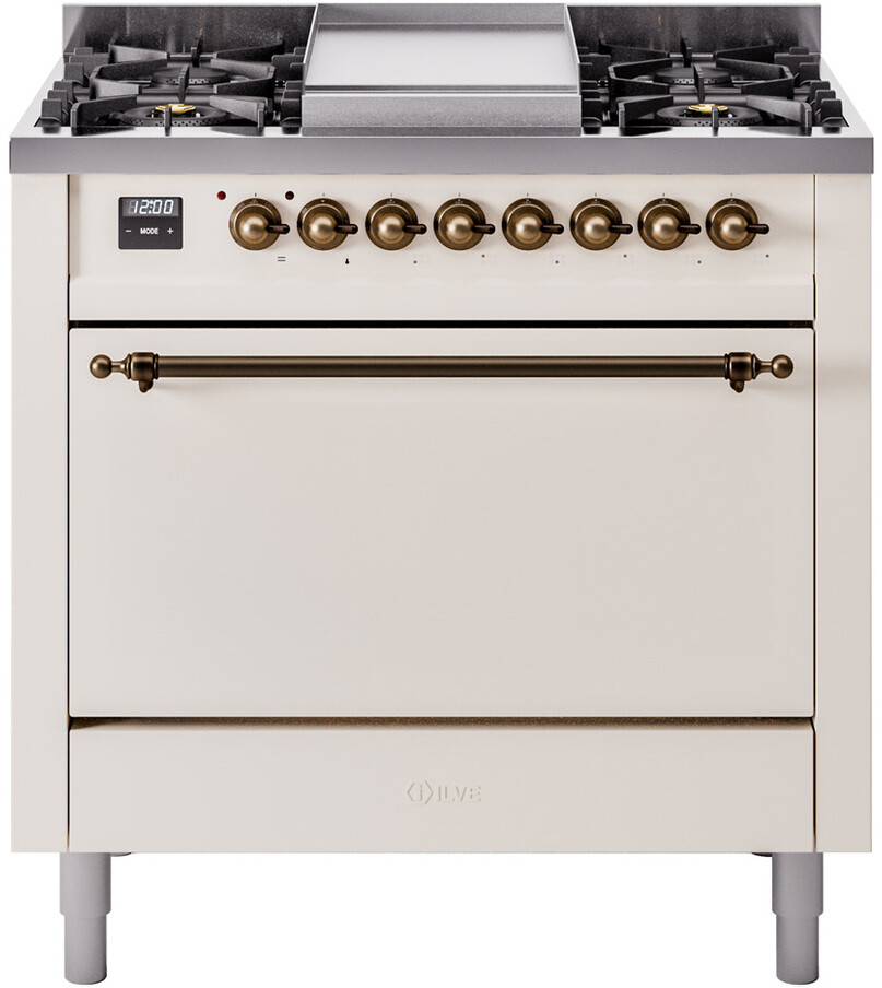 Freestanding Dual Fuel Range with 6 Sealed Burners, 3.5 cu. ft. Oven Capacity, Storage Drawer, and Griddle: Antique White, Bronze Trim. Expand your cooking possibilities with six sealed burners, designed for easy cleaning and even heat distribution. Accommodate large meals effortlessly with a spacious 3.5 cubic feet oven, perfect for family dinners and special occasions. Storage Drawer. Keep your kitchen organized with a built-in storage drawer, ideal for storing cookware and accessories. Add versatility to your cooking with the integrated griddle, perfect for preparing pancakes, grilled sandwiches, and more. With power up to 20000 btu as standard. Optimal supply and perfect distribution of the heat, for all types of cooking. With non-stick nanotechnological treatment. The noble technical characteristics of brass are enriched with a nanotechnological coating that assures easy cleaning, with an elegant Total Black finish. The indestructible cast iron pan supports provide a functional and safe support for the pots. The door hinges are fitted with a shock absorber that makes the closure more gradual and noiseless. Ensure the oven temperature remains constant throughout, without fluctuating, as is the case in conventional ovens. Set at 85F for perfect proofing, or up to 575F for roasting. The grease does not stick to the surface and can therefore be cleaned more easily. Structure in AISI 304 steel with 12/10 thickness, option to choose the ideal combination between a gas hob with up to 9 burners or induction, mixed and in various setups. The quick oven preheating function allows it to reach the desired temperature in a short time and you can then choose the best-suited cooking mode for the dish. It also works as rapid defrosting when a low temperature is set (85F - 105F). Pizza function. Quick start. Multiple fan cooking. Intensive cooking. Fan grill cooking. Grill cooking with closed-door. Cooking from above. Cooking from below. Static normal cooking. Series: Nostalgie II. Color: Antique White - Bronze Trim. Fuel Type: Dual Fuel. Gas Type: Natural Gas. Installation Type: Freestanding. Sabbath Mode: No. Number of Racks: 2. Drawer Type: Storage Drawer. Display Type: LCD Display. Timer: Yes. Cooking Probe: Yes. Rotisserie: Yes. Soft Close Door: Yes. Cooktop Configuration: 6 Sealed Burners + Griddle. Burner/Element Type: Sealed Burner. Number of Burners/Elements: 6. Griddle: Yes. Grill: No. French Top: No. Burner Output 1: 25000 BTU/h - 900 BTU/h. Burner Output 2: 7000 BTU/h - 1400 BTU/h. Burner Output 3: 25000 BTU/h - 900 BTU/h. Burner Output 4: 10500 BTU/h - 2000 BTU/h. Burner Output 5: 10500 BTU/h - 2000 BTU/h. Burner Output 6: 10500 BTU/h - 2000 BTU/h. Oven Control Type: Knobs. Oven Door Type: Solid Door. Number of Ovens: Single Oven. Main Oven Capacity (cu. ft.): 3.5. Oven Cleaning Type: Easy Clean Enamel Cavities. Main Oven Type: UOV 80 M. Voltage: 240 V. Amps: 15.4 A. ADA Compliant: No. Star-K Certified: No. Width: 35 3/4". Depth: 25". Height: 36 1/4" - 38 1/2". Exterior Width: 36".