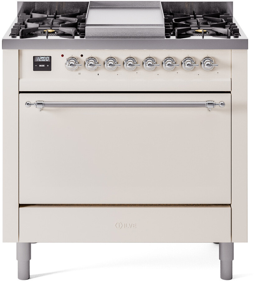 Freestanding Dual Fuel Range with 6 Sealed Burners, 3.5 cu. ft. Oven Capacity, Storage Drawer, and Griddle: Antique White, Chrome Trim. Expand your cooking possibilities with six sealed burners, designed for easy cleaning and even heat distribution. Accommodate large meals effortlessly with a spacious 3.5 cubic feet oven, perfect for family dinners and special occasions. Storage Drawer. Keep your kitchen organized with a built-in storage drawer, ideal for storing cookware and accessories. Add versatility to your cooking with the integrated griddle, perfect for preparing pancakes, grilled sandwiches, and more. With power up to 20000 btu as standard. Optimal supply and perfect distribution of the heat, for all types of cooking. With non-stick nanotechnological treatment. The noble technical characteristics of brass are enriched with a nanotechnological coating that assures easy cleaning, with an elegant Total Black finish. The indestructible cast iron pan supports provide a functional and safe support for the pots. The door hinges are fitted with a shock absorber that makes the closure more gradual and noiseless. Ensure the oven temperature remains constant throughout, without fluctuating, as is the case in conventional ovens. Set at 85F for perfect proofing, or up to 575F for roasting. The grease does not stick to the surface and can therefore be cleaned more easily. Structure in AISI 304 steel with 12/10 thickness, option to choose the ideal combination between a gas hob with up to 9 burners or induction, mixed and in various setups. The quick oven preheating function allows it to reach the desired temperature in a short time and you can then choose the best-suited cooking mode for the dish. It also works as rapid defrosting when a low temperature is set (85F - 105F). Pizza function. Quick start. Multiple fan cooking. Intensive cooking. Fan grill cooking. Grill cooking with closed-door. Cooking from above. Cooking from below. Static normal cooking. Series: Nostalgie II. Color: Antique White - Chrome Trim. Fuel Type: Dual Fuel. Gas Type: Natural Gas. Installation Type: Freestanding. Sabbath Mode: No. Number of Racks: 2. Drawer Type: Storage Drawer. Display Type: LCD Display. Timer: Yes. Cooking Probe: Yes. Rotisserie: Yes. Soft Close Door: Yes. Cooktop Configuration: 6 Sealed Burners + Griddle. Burner/Element Type: Sealed Burner. Number of Burners/Elements: 6. Griddle: Yes. Grill: No. French Top: No. Burner Output 1: 25000 BTU/h - 900 BTU/h. Burner Output 2: 7000 BTU/h - 1400 BTU/h. Burner Output 3: 25000 BTU/h - 900 BTU/h. Burner Output 4: 10500 BTU/h - 2000 BTU/h. Burner Output 5: 10500 BTU/h - 2000 BTU/h. Burner Output 6: 10500 BTU/h - 2000 BTU/h. Oven Control Type: Knobs. Oven Door Type: Solid Door. Number of Ovens: Single Oven. Main Oven Capacity (cu. ft.): 3.5. Oven Cleaning Type: Easy Clean Enamel Cavities. Main Oven Type: UOV 80 M. Voltage: 240 V. Amps: 15.4 A. ADA Compliant: No. Star-K Certified: No. Width: 35 3/4". Depth: 25". Height: 36 1/4" - 38 1/2". Exterior Width: 36".