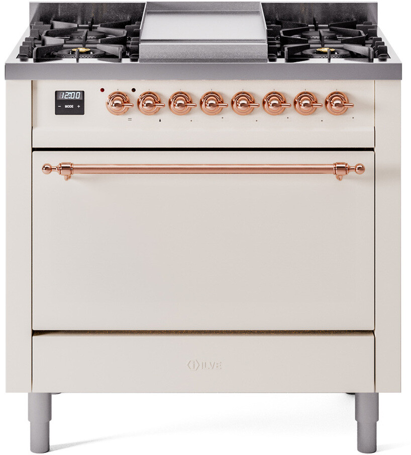 Freestanding Dual Fuel Range with 6 Sealed Burners, 3.5 cu. ft. Oven Capacity, Storage Drawer, and Griddle: Antique White, Copper Trim. Expand your cooking possibilities with six sealed burners, designed for easy cleaning and even heat distribution. Accommodate large meals effortlessly with a spacious 3.5 cubic feet oven, perfect for family dinners and special occasions. Storage Drawer. Keep your kitchen organized with a built-in storage drawer, ideal for storing cookware and accessories. Add versatility to your cooking with the integrated griddle, perfect for preparing pancakes, grilled sandwiches, and more. With power up to 20000 btu as standard. Optimal supply and perfect distribution of the heat, for all types of cooking. With non-stick nanotechnological treatment. The noble technical characteristics of brass are enriched with a nanotechnological coating that assures easy cleaning, with an elegant Total Black finish. The indestructible cast iron pan supports provide a functional and safe support for the pots. The door hinges are fitted with a shock absorber that makes the closure more gradual and noiseless. Ensure the oven temperature remains constant throughout, without fluctuating, as is the case in conventional ovens. Set at 85F for perfect proofing, or up to 575F for roasting. The grease does not stick to the surface and can therefore be cleaned more easily. Structure in AISI 304 steel with 12/10 thickness, option to choose the ideal combination between a gas hob with up to 9 burners or induction, mixed and in various setups. The quick oven preheating function allows it to reach the desired temperature in a short time and you can then choose the best-suited cooking mode for the dish. It also works as rapid defrosting when a low temperature is set (85F - 105F). Pizza function. Quick start. Multiple fan cooking. Intensive cooking. Fan grill cooking. Grill cooking with closed-door. Cooking from above. Cooking from below. Static normal cooking. Series: Nostalgie II. Color: Antique White - Copper Trim. Fuel Type: Dual Fuel. Gas Type: Natural Gas. Installation Type: Freestanding. Sabbath Mode: No. Number of Racks: 2. Drawer Type: Storage Drawer. Display Type: LCD Display. Timer: Yes. Cooking Probe: Yes. Rotisserie: Yes. Soft Close Door: Yes. Cooktop Configuration: 6 Sealed Burners + Griddle. Burner/Element Type: Sealed Burner. Number of Burners/Elements: 6. Griddle: Yes. Grill: No. French Top: No. Burner Output 1: 25000 BTU/h - 900 BTU/h. Burner Output 2: 7000 BTU/h - 1400 BTU/h. Burner Output 3: 25000 BTU/h - 900 BTU/h. Burner Output 4: 10500 BTU/h - 2000 BTU/h. Burner Output 5: 10500 BTU/h - 2000 BTU/h. Burner Output 6: 10500 BTU/h - 2000 BTU/h. Oven Control Type: Knobs. Oven Door Type: Solid Door. Number of Ovens: Single Oven. Main Oven Capacity (cu. ft.): 3.5. Oven Cleaning Type: Easy Clean Enamel Cavities. Main Oven Type: UOV 80 M. Voltage: 240 V. Amps: 15.4 A. ADA Compliant: No. Star-K Certified: No. Width: 35 3/4". Depth: 25". Height: 36 1/4" - 38 1/2". Exterior Width: 36".