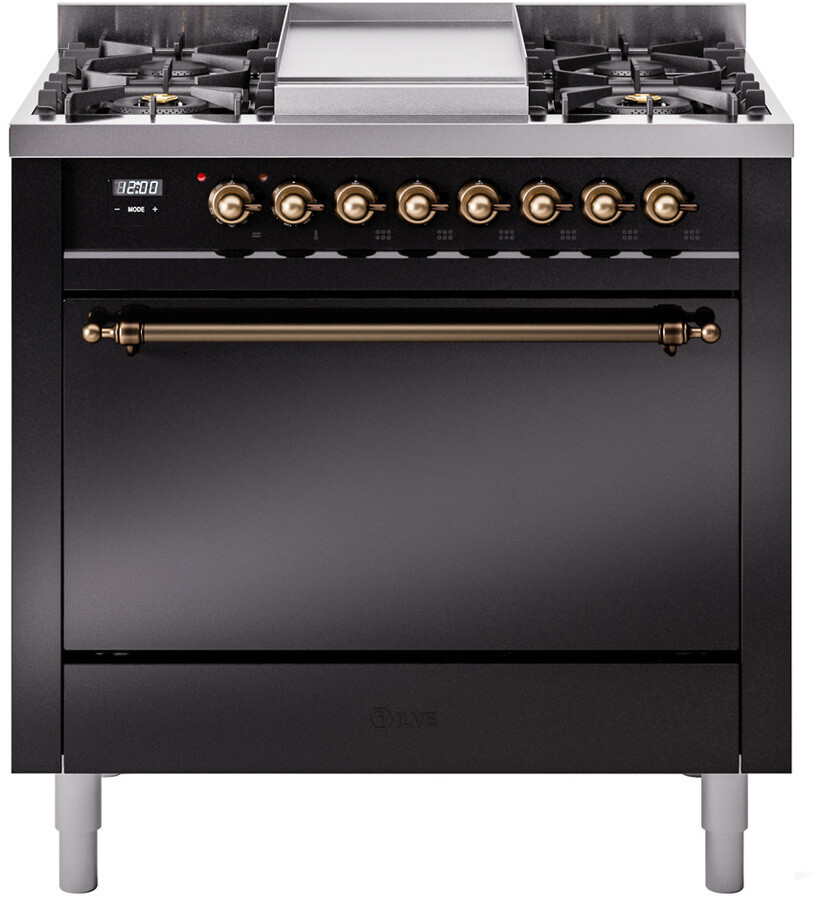 Freestanding Dual Fuel Range with 6 Sealed Burners, 3.5 cu. ft. Oven Capacity, Storage Drawer, and Griddle: Glossy Black, Bronze Trim. Expand your cooking possibilities with six sealed burners, designed for easy cleaning and even heat distribution. Accommodate large meals effortlessly with a spacious 3.5 cubic feet oven, perfect for family dinners and special occasions. Storage Drawer. Keep your kitchen organized with a built-in storage drawer, ideal for storing cookware and accessories. Add versatility to your cooking with the integrated griddle, perfect for preparing pancakes, grilled sandwiches, and more. With power up to 20000 btu as standard. Optimal supply and perfect distribution of the heat, for all types of cooking. With non-stick nanotechnological treatment. The noble technical characteristics of brass are enriched with a nanotechnological coating that assures easy cleaning, with an elegant Total Black finish. The indestructible cast iron pan supports provide a functional and safe support for the pots. The door hinges are fitted with a shock absorber that makes the closure more gradual and noiseless. Ensure the oven temperature remains constant throughout, without fluctuating, as is the case in conventional ovens. Set at 85F for perfect proofing, or up to 575F for roasting. The grease does not stick to the surface and can therefore be cleaned more easily. Structure in AISI 304 steel with 12/10 thickness, option to choose the ideal combination between a gas hob with up to 9 burners or induction, mixed and in various setups. The quick oven preheating function allows it to reach the desired temperature in a short time and you can then choose the best-suited cooking mode for the dish. It also works as rapid defrosting when a low temperature is set (85F - 105F). Pizza function. Quick start. Multiple fan cooking. Intensive cooking. Fan grill cooking. Grill cooking with closed-door. Cooking from above. Cooking from below. Static normal cooking. Series: Nostalgie II. Color: Glossy Black - Bronze Trim. Fuel Type: Dual Fuel. Gas Type: Natural Gas. Installation Type: Freestanding. Sabbath Mode: No. Number of Racks: 2. Drawer Type: Storage Drawer. Display Type: LCD Display. Timer: Yes. Cooking Probe: Yes. Rotisserie: Yes. Soft Close Door: Yes. Cooktop Configuration: 6 Sealed Burners + Griddle. Burner/Element Type: Sealed Burner. Number of Burners/Elements: 6. Griddle: Yes. Grill: No. French Top: No. Burner Output 1: 25000 BTU/h - 900 BTU/h. Burner Output 2: 7000 BTU/h - 1400 BTU/h. Burner Output 3: 25000 BTU/h - 900 BTU/h. Burner Output 4: 10500 BTU/h - 2000 BTU/h. Burner Output 5: 10500 BTU/h - 2000 BTU/h. Burner Output 6: 10500 BTU/h - 2000 BTU/h. Oven Control Type: Knobs. Oven Door Type: Solid Door. Number of Ovens: Single Oven. Main Oven Capacity (cu. ft.): 3.5. Oven Cleaning Type: Easy Clean Enamel Cavities. Main Oven Type: UOV 80 M. Voltage: 240 V. Amps: 15.4 A. ADA Compliant: No. Star-K Certified: No. Width: 35 3/4". Depth: 25". Height: 36 1/4" - 38 1/2". Exterior Width: 36".