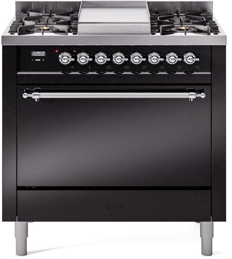 Freestanding Dual Fuel Range with 6 Sealed Burners, 3.5 cu. ft. Oven Capacity, Storage Drawer, and Griddle: Glossy Black, Chrome Trim. Expand your cooking possibilities with six sealed burners, designed for easy cleaning and even heat distribution. Accommodate large meals effortlessly with a spacious 3.5 cubic feet oven, perfect for family dinners and special occasions. Storage Drawer. Keep your kitchen organized with a built-in storage drawer, ideal for storing cookware and accessories. Add versatility to your cooking with the integrated griddle, perfect for preparing pancakes, grilled sandwiches, and more. With power up to 20000 btu as standard. Optimal supply and perfect distribution of the heat, for all types of cooking. With non-stick nanotechnological treatment. The noble technical characteristics of brass are enriched with a nanotechnological coating that assures easy cleaning, with an elegant Total Black finish. The indestructible cast iron pan supports provide a functional and safe support for the pots. The door hinges are fitted with a shock absorber that makes the closure more gradual and noiseless. Ensure the oven temperature remains constant throughout, without fluctuating, as is the case in conventional ovens. Set at 85F for perfect proofing, or up to 575F for roasting. The grease does not stick to the surface and can therefore be cleaned more easily. Structure in AISI 304 steel with 12/10 thickness, option to choose the ideal combination between a gas hob with up to 9 burners or induction, mixed and in various setups. The quick oven preheating function allows it to reach the desired temperature in a short time and you can then choose the best-suited cooking mode for the dish. It also works as rapid defrosting when a low temperature is set (85F - 105F). Pizza function. Quick start. Multiple fan cooking. Intensive cooking. Fan grill cooking. Grill cooking with closed-door. Cooking from above. Cooking from below. Static normal cooking. Series: Nostalgie II. Color: Glossy Black - Chrome Trim. Fuel Type: Dual Fuel. Gas Type: Natural Gas. Installation Type: Freestanding. Sabbath Mode: No. Number of Racks: 2. Drawer Type: Storage Drawer. Display Type: LCD Display. Timer: Yes. Cooking Probe: Yes. Rotisserie: Yes. Soft Close Door: Yes. Cooktop Configuration: 6 Sealed Burners + Griddle. Burner/Element Type: Sealed Burner. Number of Burners/Elements: 6. Griddle: Yes. Grill: No. French Top: No. Burner Output 1: 25000 BTU/h - 900 BTU/h. Burner Output 2: 7000 BTU/h - 1400 BTU/h. Burner Output 3: 25000 BTU/h - 900 BTU/h. Burner Output 4: 10500 BTU/h - 2000 BTU/h. Burner Output 5: 10500 BTU/h - 2000 BTU/h. Burner Output 6: 10500 BTU/h - 2000 BTU/h. Oven Control Type: Knobs. Oven Door Type: Solid Door. Number of Ovens: Single Oven. Main Oven Capacity (cu. ft.): 3.5. Oven Cleaning Type: Easy Clean Enamel Cavities. Main Oven Type: UOV 80 M. Voltage: 240 V. Amps: 15.4 A. ADA Compliant: No. Star-K Certified: No. Width: 35 3/4". Depth: 25". Height: 36 1/4" - 38 1/2". Exterior Width: 36".