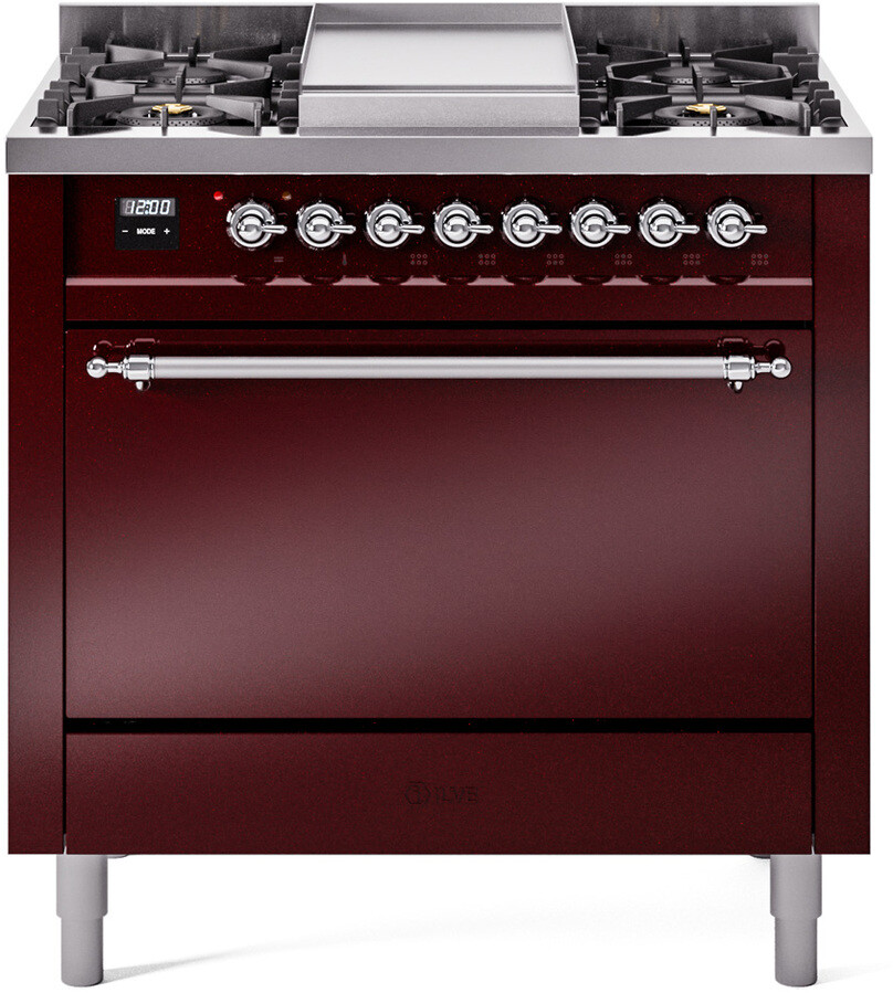 Freestanding Dual Fuel Range with 6 Sealed Burners, 3.5 cu. ft. Oven Capacity, Storage Drawer, and Griddle: Burgundy, Chrome Trim. Expand your cooking possibilities with six sealed burners, designed for easy cleaning and even heat distribution. Accommodate large meals effortlessly with a spacious 3.5 cubic feet oven, perfect for family dinners and special occasions. Storage Drawer. Keep your kitchen organized with a built-in storage drawer, ideal for storing cookware and accessories. Add versatility to your cooking with the integrated griddle, perfect for preparing pancakes, grilled sandwiches, and more. With power up to 20000 btu as standard. Optimal supply and perfect distribution of the heat, for all types of cooking. With non-stick nanotechnological treatment. The noble technical characteristics of brass are enriched with a nanotechnological coating that assures easy cleaning, with an elegant Total Black finish. The indestructible cast iron pan supports provide a functional and safe support for the pots. The door hinges are fitted with a shock absorber that makes the closure more gradual and noiseless. Ensure the oven temperature remains constant throughout, without fluctuating, as is the case in conventional ovens. Set at 85F for perfect proofing, or up to 575F for roasting. The grease does not stick to the surface and can therefore be cleaned more easily. Structure in AISI 304 steel with 12/10 thickness, option to choose the ideal combination between a gas hob with up to 9 burners or induction, mixed and in various setups. The quick oven preheating function allows it to reach the desired temperature in a short time and you can then choose the best-suited cooking mode for the dish. It also works as rapid defrosting when a low temperature is set (85F - 105F). Pizza function. Quick start. Multiple fan cooking. Intensive cooking. Fan grill cooking. Grill cooking with closed-door. Cooking from above. Cooking from below. Static normal cooking. Series: Nostalgie II. Color: Burgundy - Chrome Trim. Fuel Type: Dual Fuel. Gas Type: Natural Gas. Installation Type: Freestanding. Sabbath Mode: No. Number of Racks: 2. Drawer Type: Storage Drawer. Display Type: LCD Display. Timer: Yes. Cooking Probe: Yes. Rotisserie: Yes. Soft Close Door: Yes. Cooktop Configuration: 6 Sealed Burners + Griddle. Burner/Element Type: Sealed Burner. Number of Burners/Elements: 6. Griddle: Yes. Grill: No. French Top: No. Burner Output 1: 25000 BTU/h - 900 BTU/h. Burner Output 2: 7000 BTU/h - 1400 BTU/h. Burner Output 3: 25000 BTU/h - 900 BTU/h. Burner Output 4: 10500 BTU/h - 2000 BTU/h. Burner Output 5: 10500 BTU/h - 2000 BTU/h. Burner Output 6: 10500 BTU/h - 2000 BTU/h. Oven Control Type: Knobs. Oven Door Type: Solid Door. Number of Ovens: Single Oven. Main Oven Capacity (cu. ft.): 3.5. Oven Cleaning Type: Easy Clean Enamel Cavities. Main Oven Type: UOV 80 M. Voltage: 240 V. Amps: 15.4 A. ADA Compliant: No. Star-K Certified: No. Width: 35 3/4". Depth: 25". Height: 36 1/4" - 38 1/2". Exterior Width: 36".