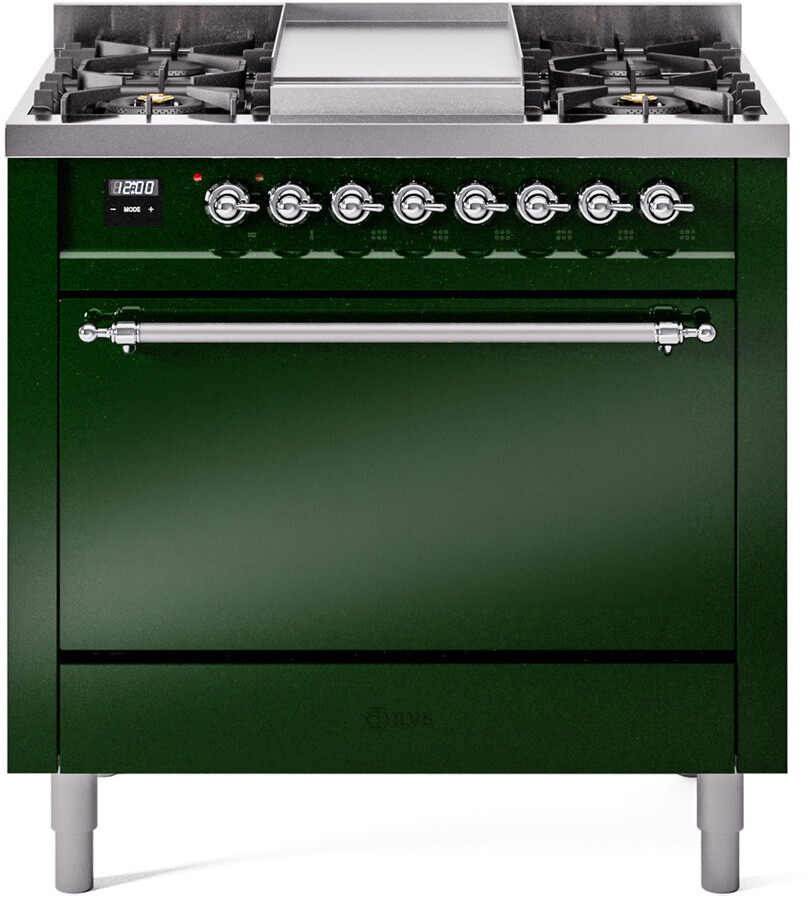 Freestanding Dual Fuel Range with 6 Sealed Burners, 3.5 cu. ft. Oven Capacity, Storage Drawer, and Griddle: Emerald Green, Chrome Trim. Expand your cooking possibilities with six sealed burners, designed for easy cleaning and even heat distribution. Accommodate large meals effortlessly with a spacious 3.5 cubic feet oven, perfect for family dinners and special occasions. Storage Drawer. Keep your kitchen organized with a built-in storage drawer, ideal for storing cookware and accessories. Add versatility to your cooking with the integrated griddle, perfect for preparing pancakes, grilled sandwiches, and more. With power up to 20000 btu as standard. Optimal supply and perfect distribution of the heat, for all types of cooking. With non-stick nanotechnological treatment. The noble technical characteristics of brass are enriched with a nanotechnological coating that assures easy cleaning, with an elegant Total Black finish. The indestructible cast iron pan supports provide a functional and safe support for the pots. The door hinges are fitted with a shock absorber that makes the closure more gradual and noiseless. Ensure the oven temperature remains constant throughout, without fluctuating, as is the case in conventional ovens. Set at 85F for perfect proofing, or up to 575F for roasting. The grease does not stick to the surface and can therefore be cleaned more easily. Structure in AISI 304 steel with 12/10 thickness, option to choose the ideal combination between a gas hob with up to 9 burners or induction, mixed and in various setups. The quick oven preheating function allows it to reach the desired temperature in a short time and you can then choose the best-suited cooking mode for the dish. It also works as rapid defrosting when a low temperature is set (85F - 105F). Pizza function. Quick start. Multiple fan cooking. Intensive cooking. Fan grill cooking. Grill cooking with closed-door. Cooking from above. Cooking from below. Static normal cooking. Series: Nostalgie II. Color: Emerald Green - Chrome Trim. Fuel Type: Dual Fuel. Gas Type: Natural Gas. Installation Type: Freestanding. Sabbath Mode: No. Number of Racks: 2. Drawer Type: Storage Drawer. Display Type: LCD Display. Timer: Yes. Cooking Probe: Yes. Rotisserie: Yes. Soft Close Door: Yes. Cooktop Configuration: 6 Sealed Burners + Griddle. Burner/Element Type: Sealed Burner. Number of Burners/Elements: 6. Griddle: Yes. Grill: No. French Top: No. Burner Output 1: 25000 BTU/h - 900 BTU/h. Burner Output 2: 7000 BTU/h - 1400 BTU/h. Burner Output 3: 25000 BTU/h - 900 BTU/h. Burner Output 4: 10500 BTU/h - 2000 BTU/h. Burner Output 5: 10500 BTU/h - 2000 BTU/h. Burner Output 6: 10500 BTU/h - 2000 BTU/h. Oven Control Type: Knobs. Oven Door Type: Solid Door. Number of Ovens: Single Oven. Main Oven Capacity (cu. ft.): 3.5. Oven Cleaning Type: Easy Clean Enamel Cavities. Main Oven Type: UOV 80 M. Voltage: 240 V. Amps: 15.4 A. ADA Compliant: No. Star-K Certified: No. Width: 35 3/4". Depth: 25". Height: 36 1/4" - 38 1/2". Exterior Width: 36".