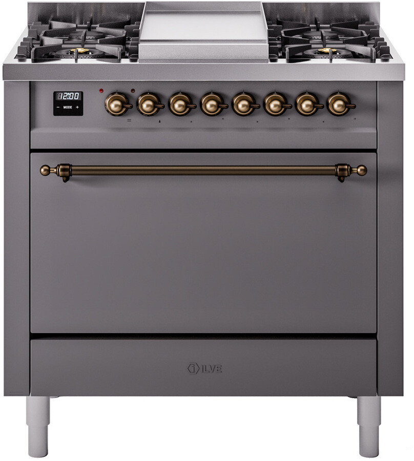Freestanding Dual Fuel Range with 6 Sealed Burners, 3.5 cu. ft. Oven Capacity, Storage Drawer, and Griddle: Graphite Matte, Bronze Trim. Expand your cooking possibilities with six sealed burners, designed for easy cleaning and even heat distribution. Accommodate large meals effortlessly with a spacious 3.5 cubic feet oven, perfect for family dinners and special occasions. Storage Drawer. Keep your kitchen organized with a built-in storage drawer, ideal for storing cookware and accessories. Add versatility to your cooking with the integrated griddle, perfect for preparing pancakes, grilled sandwiches, and more. With power up to 20000 btu as standard. Optimal supply and perfect distribution of the heat, for all types of cooking. With non-stick nanotechnological treatment. The noble technical characteristics of brass are enriched with a nanotechnological coating that assures easy cleaning, with an elegant Total Black finish. The indestructible cast iron pan supports provide a functional and safe support for the pots. The door hinges are fitted with a shock absorber that makes the closure more gradual and noiseless. Ensure the oven temperature remains constant throughout, without fluctuating, as is the case in conventional ovens. Set at 85F for perfect proofing, or up to 575F for roasting. The grease does not stick to the surface and can therefore be cleaned more easily. Structure in AISI 304 steel with 12/10 thickness, option to choose the ideal combination between a gas hob with up to 9 burners or induction, mixed and in various setups. The quick oven preheating function allows it to reach the desired temperature in a short time and you can then choose the best-suited cooking mode for the dish. It also works as rapid defrosting when a low temperature is set (85F - 105F). Pizza function. Quick start. Multiple fan cooking. Intensive cooking. Fan grill cooking. Grill cooking with closed-door. Cooking from above. Cooking from below. Static normal cooking. Series: Nostalgie II. Color: Graphite Matte, Bronze Trim. Fuel Type: Dual Fuel. Gas Type: Natural Gas. Installation Type: Freestanding. Sabbath Mode: No. Number of Racks: 2. Drawer Type: Storage Drawer. Display Type: LCD Display. Timer: Yes. Cooking Probe: Yes. Rotisserie: Yes. Soft Close Door: Yes. Cooktop Configuration: 6 Sealed Burners + Griddle. Burner/Element Type: Sealed Burner. Number of Burners/Elements: 6. Griddle: Yes. Grill: No. French Top: No. Burner Output 1: 25000 BTU/h - 900 BTU/h. Burner Output 2: 7000 BTU/h - 1400 BTU/h. Burner Output 3: 25000 BTU/h - 900 BTU/h. Burner Output 4: 10500 BTU/h - 2000 BTU/h. Burner Output 5: 10500 BTU/h - 2000 BTU/h. Burner Output 6: 10500 BTU/h - 2000 BTU/h. Oven Control Type: Knobs. Oven Door Type: Solid Door. Number of Ovens: Single Oven. Main Oven Capacity (cu. ft.): 3.5. Oven Cleaning Type: Easy Clean Enamel Cavities. Main Oven Type: UOV 80 M. Voltage: 240 V. Amps: 15.4 A. ADA Compliant: No. Star-K Certified: No. Width: 35 3/4". Depth: 25". Height: 36 1/4" - 38 1/2". Exterior Width: 36".