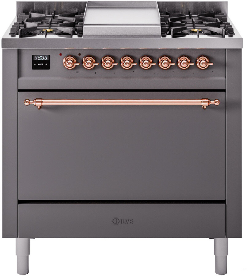 Freestanding Dual Fuel Range with 6 Sealed Burners, 3.5 cu. ft. Oven Capacity, Storage Drawer, and Griddle: Graphite Matte, Copper Trim. Expand your cooking possibilities with six sealed burners, designed for easy cleaning and even heat distribution. Accommodate large meals effortlessly with a spacious 3.5 cubic feet oven, perfect for family dinners and special occasions. Storage Drawer. Keep your kitchen organized with a built-in storage drawer, ideal for storing cookware and accessories. Add versatility to your cooking with the integrated griddle, perfect for preparing pancakes, grilled sandwiches, and more. With power up to 20000 btu as standard. Optimal supply and perfect distribution of the heat, for all types of cooking. With non-stick nanotechnological treatment. The noble technical characteristics of brass are enriched with a nanotechnological coating that assures easy cleaning, with an elegant Total Black finish. The indestructible cast iron pan supports provide a functional and safe support for the pots. The door hinges are fitted with a shock absorber that makes the closure more gradual and noiseless. Ensure the oven temperature remains constant throughout, without fluctuating, as is the case in conventional ovens. Set at 85F for perfect proofing, or up to 575F for roasting. The grease does not stick to the surface and can therefore be cleaned more easily. Structure in AISI 304 steel with 12/10 thickness, option to choose the ideal combination between a gas hob with up to 9 burners or induction, mixed and in various setups. The quick oven preheating function allows it to reach the desired temperature in a short time and you can then choose the best-suited cooking mode for the dish. It also works as rapid defrosting when a low temperature is set (85F - 105F). Pizza function. Quick start. Multiple fan cooking. Intensive cooking. Fan grill cooking. Grill cooking with closed-door. Cooking from above. Cooking from below. Static normal cooking. Series: Nostalgie II. Color: Graphite Matte, Copper Trim. Fuel Type: Dual Fuel. Gas Type: Natural Gas. Installation Type: Freestanding. Sabbath Mode: No. Number of Racks: 2. Drawer Type: Storage Drawer. Display Type: LCD Display. Timer: Yes. Cooking Probe: Yes. Rotisserie: Yes. Soft Close Door: Yes. Cooktop Configuration: 6 Sealed Burners + Griddle. Burner/Element Type: Sealed Burner. Number of Burners/Elements: 6. Griddle: Yes. Grill: No. French Top: No. Burner Output 1: 25000 BTU/h - 900 BTU/h. Burner Output 2: 7000 BTU/h - 1400 BTU/h. Burner Output 3: 25000 BTU/h - 900 BTU/h. Burner Output 4: 10500 BTU/h - 2000 BTU/h. Burner Output 5: 10500 BTU/h - 2000 BTU/h. Burner Output 6: 10500 BTU/h - 2000 BTU/h. Oven Control Type: Knobs. Oven Door Type: Solid Door. Number of Ovens: Single Oven. Main Oven Capacity (cu. ft.): 3.5. Oven Cleaning Type: Easy Clean Enamel Cavities. Main Oven Type: UOV 80 M. Voltage: 240 V. Amps: 15.4 A. ADA Compliant: No. Star-K Certified: No. Width: 35 3/4". Depth: 25". Height: 36 1/4" - 38 1/2". Exterior Width: 36".