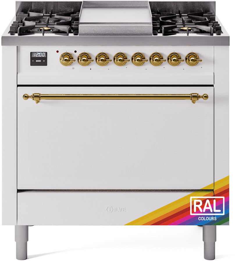Freestanding Dual Fuel Range with 6 Sealed Burners, 3.5 cu. ft. Oven Capacity, Storage Drawer, and Griddle: RAL Color, Brass Trim. Expand your cooking possibilities with six sealed burners, designed for easy cleaning and even heat distribution. Accommodate large meals effortlessly with a spacious 3.5 cubic feet oven, perfect for family dinners and special occasions. Storage Drawer. Keep your kitchen organized with a built-in storage drawer, ideal for storing cookware and accessories. Add versatility to your cooking with the integrated griddle, perfect for preparing pancakes, grilled sandwiches, and more. With power up to 20000 btu as standard. Optimal supply and perfect distribution of the heat, for all types of cooking. With non-stick nanotechnological treatment. The noble technical characteristics of brass are enriched with a nanotechnological coating that assures easy cleaning, with an elegant Total Black finish. The indestructible cast iron pan supports provide a functional and safe support for the pots. The door hinges are fitted with a shock absorber that makes the closure more gradual and noiseless. Ensure the oven temperature remains constant throughout, without fluctuating, as is the case in conventional ovens. Set at 85F for perfect proofing, or up to 575F for roasting. The grease does not stick to the surface and can therefore be cleaned more easily. Structure in AISI 304 steel with 12/10 thickness, option to choose the ideal combination between a gas hob with up to 9 burners or induction, mixed and in various setups. The quick oven preheating function allows it to reach the desired temperature in a short time and you can then choose the best-suited cooking mode for the dish. It also works as rapid defrosting when a low temperature is set (85F - 105F). Pizza function. Quick start. Multiple fan cooking. Intensive cooking. Fan grill cooking. Grill cooking with closed-door. Cooking from above. Cooking from below. Static normal cooking. Series: Nostalgie II. Color: RAL - Brass Trim. Fuel Type: Dual Fuel. Gas Type: Natural Gas. Installation Type: Freestanding. Sabbath Mode: No. Number of Racks: 2. Drawer Type: Storage Drawer. Display Type: LCD Display. Timer: Yes. Cooking Probe: Yes. Rotisserie: Yes. Soft Close Door: Yes. Cooktop Configuration: 6 Sealed Burners + Griddle. Burner/Element Type: Sealed Burner. Number of Burners/Elements: 6. Griddle: Yes. Grill: No. French Top: No. Burner Output 1: 25000 BTU/h - 900 BTU/h. Burner Output 2: 7000 BTU/h - 1400 BTU/h. Burner Output 3: 25000 BTU/h - 900 BTU/h. Burner Output 4: 10500 BTU/h - 2000 BTU/h. Burner Output 5: 10500 BTU/h - 2000 BTU/h. Burner Output 6: 10500 BTU/h - 2000 BTU/h. Oven Control Type: Knobs. Oven Door Type: Solid Door. Number of Ovens: Single Oven. Main Oven Capacity (cu. ft.): 3.5. Oven Cleaning Type: Easy Clean Enamel Cavities. Main Oven Type: UOV 80 M. Voltage: 240 V. Amps: 15.4 A. ADA Compliant: No. Star-K Certified: No. Width: 35 3/4". Depth: 25". Height: 36 1/4" - 38 1/2". Exterior Width: 36".