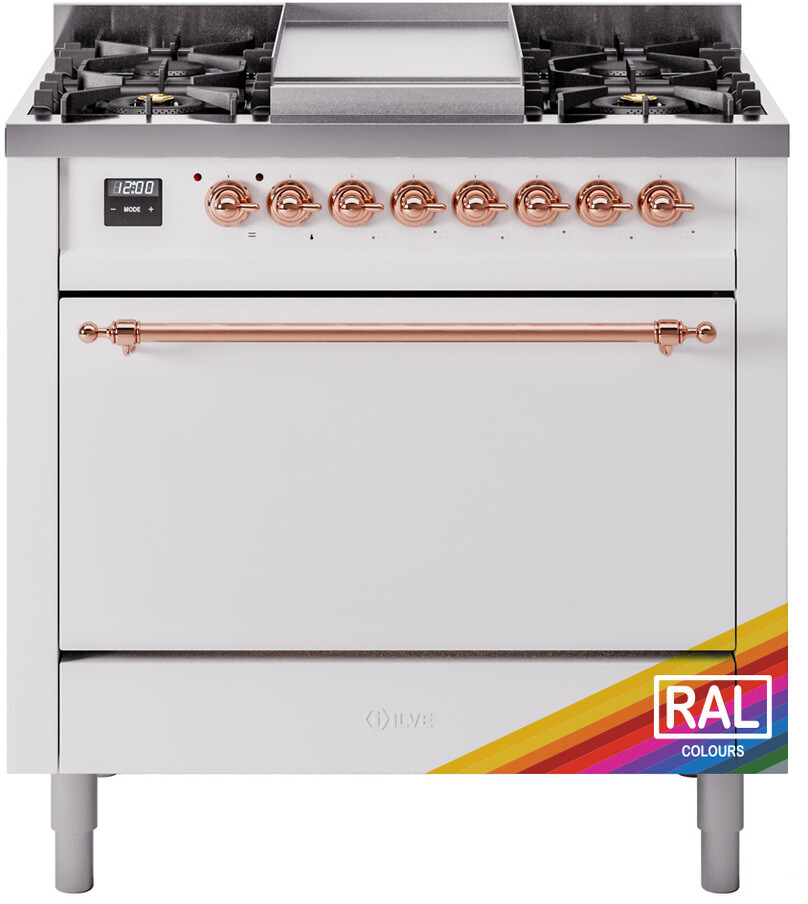 Freestanding Dual Fuel Range with 6 Sealed Burners, 3.5 cu. ft. Oven Capacity, Storage Drawer, and Griddle: RAL Color, Copper Trim. Expand your cooking possibilities with six sealed burners, designed for easy cleaning and even heat distribution. Accommodate large meals effortlessly with a spacious 3.5 cubic feet oven, perfect for family dinners and special occasions. Storage Drawer. Keep your kitchen organized with a built-in storage drawer, ideal for storing cookware and accessories. Add versatility to your cooking with the integrated griddle, perfect for preparing pancakes, grilled sandwiches, and more. With power up to 20000 btu as standard. Optimal supply and perfect distribution of the heat, for all types of cooking. With non-stick nanotechnological treatment. The noble technical characteristics of brass are enriched with a nanotechnological coating that assures easy cleaning, with an elegant Total Black finish. The indestructible cast iron pan supports provide a functional and safe support for the pots. The door hinges are fitted with a shock absorber that makes the closure more gradual and noiseless. Ensure the oven temperature remains constant throughout, without fluctuating, as is the case in conventional ovens. Set at 85F for perfect proofing, or up to 575F for roasting. The grease does not stick to the surface and can therefore be cleaned more easily. Structure in AISI 304 steel with 12/10 thickness, option to choose the ideal combination between a gas hob with up to 9 burners or induction, mixed and in various setups. The quick oven preheating function allows it to reach the desired temperature in a short time and you can then choose the best-suited cooking mode for the dish. It also works as rapid defrosting when a low temperature is set (85F - 105F). Pizza function. Quick start. Multiple fan cooking. Intensive cooking. Fan grill cooking. Grill cooking with closed-door. Cooking from above. Cooking from below. Static normal cooking. Series: Nostalgie II. Color: RAL - Copper Trim. Fuel Type: Dual Fuel. Gas Type: Natural Gas. Installation Type: Freestanding. Sabbath Mode: No. Number of Racks: 2. Drawer Type: Storage Drawer. Display Type: LCD Display. Timer: Yes. Cooking Probe: Yes. Rotisserie: Yes. Soft Close Door: Yes. Cooktop Configuration: 6 Sealed Burners + Griddle. Burner/Element Type: Sealed Burner. Number of Burners/Elements: 6. Griddle: Yes. Grill: No. French Top: No. Burner Output 1: 25000 BTU/h - 900 BTU/h. Burner Output 2: 7000 BTU/h - 1400 BTU/h. Burner Output 3: 25000 BTU/h - 900 BTU/h. Burner Output 4: 10500 BTU/h - 2000 BTU/h. Burner Output 5: 10500 BTU/h - 2000 BTU/h. Burner Output 6: 10500 BTU/h - 2000 BTU/h. Oven Control Type: Knobs. Oven Door Type: Solid Door. Number of Ovens: Single Oven. Main Oven Capacity (cu. ft.): 3.5. Oven Cleaning Type: Easy Clean Enamel Cavities. Main Oven Type: UOV 80 M. Voltage: 240 V. Amps: 15.4 A. ADA Compliant: No. Star-K Certified: No. Width: 35 3/4". Depth: 25". Height: 36 1/4" - 38 1/2". Exterior Width: 36".