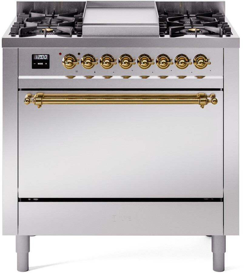 Freestanding Dual Fuel Range with 6 Sealed Burners, 3.5 cu. ft. Oven Capacity, Storage Drawer, and Griddle: Stainless Steel, Brass Trim. Expand your cooking possibilities with six sealed burners, designed for easy cleaning and even heat distribution. Accommodate large meals effortlessly with a spacious 3.5 cubic feet oven, perfect for family dinners and special occasions. Storage Drawer. Keep your kitchen organized with a built-in storage drawer, ideal for storing cookware and accessories. Add versatility to your cooking with the integrated griddle, perfect for preparing pancakes, grilled sandwiches, and more. With power up to 20000 btu as standard. Optimal supply and perfect distribution of the heat, for all types of cooking. With non-stick nanotechnological treatment. The noble technical characteristics of brass are enriched with a nanotechnological coating that assures easy cleaning, with an elegant Total Black finish. The indestructible cast iron pan supports provide a functional and safe support for the pots. The door hinges are fitted with a shock absorber that makes the closure more gradual and noiseless. Ensure the oven temperature remains constant throughout, without fluctuating, as is the case in conventional ovens. Set at 85F for perfect proofing, or up to 575F for roasting. The grease does not stick to the surface and can therefore be cleaned more easily. Structure in AISI 304 steel with 12/10 thickness, option to choose the ideal combination between a gas hob with up to 9 burners or induction, mixed and in various setups. The quick oven preheating function allows it to reach the desired temperature in a short time and you can then choose the best-suited cooking mode for the dish. It also works as rapid defrosting when a low temperature is set (85F - 105F). Pizza function. Quick start. Multiple fan cooking. Intensive cooking. Fan grill cooking. Grill cooking with closed-door. Cooking from above. Cooking from below. Static normal cooking. Series: Nostalgie II. Color: Stainless Steel - Brass Trim. Fuel Type: Dual Fuel. Gas Type: Natural Gas. Installation Type: Freestanding. Sabbath Mode: No. Number of Racks: 2. Drawer Type: Storage Drawer. Display Type: LCD Display. Timer: Yes. Cooking Probe: Yes. Rotisserie: Yes. Soft Close Door: Yes. Cooktop Configuration: 6 Sealed Burners + Griddle. Burner/Element Type: Sealed Burner. Number of Burners/Elements: 6. Griddle: Yes. Grill: No. French Top: No. Burner Output 1: 25000 BTU/h - 900 BTU/h. Burner Output 2: 7000 BTU/h - 1400 BTU/h. Burner Output 3: 25000 BTU/h - 900 BTU/h. Burner Output 4: 10500 BTU/h - 2000 BTU/h. Burner Output 5: 10500 BTU/h - 2000 BTU/h. Burner Output 6: 10500 BTU/h - 2000 BTU/h. Oven Control Type: Knobs. Oven Door Type: Solid Door. Number of Ovens: Single Oven. Main Oven Capacity (cu. ft.): 3.5. Oven Cleaning Type: Easy Clean Enamel Cavities. Main Oven Type: UOV 80 M. Voltage: 240 V. Amps: 15.4 A. ADA Compliant: No. Star-K Certified: No. Width: 35 3/4". Depth: 25". Height: 36 1/4" - 38 1/2". Exterior Width: 36".