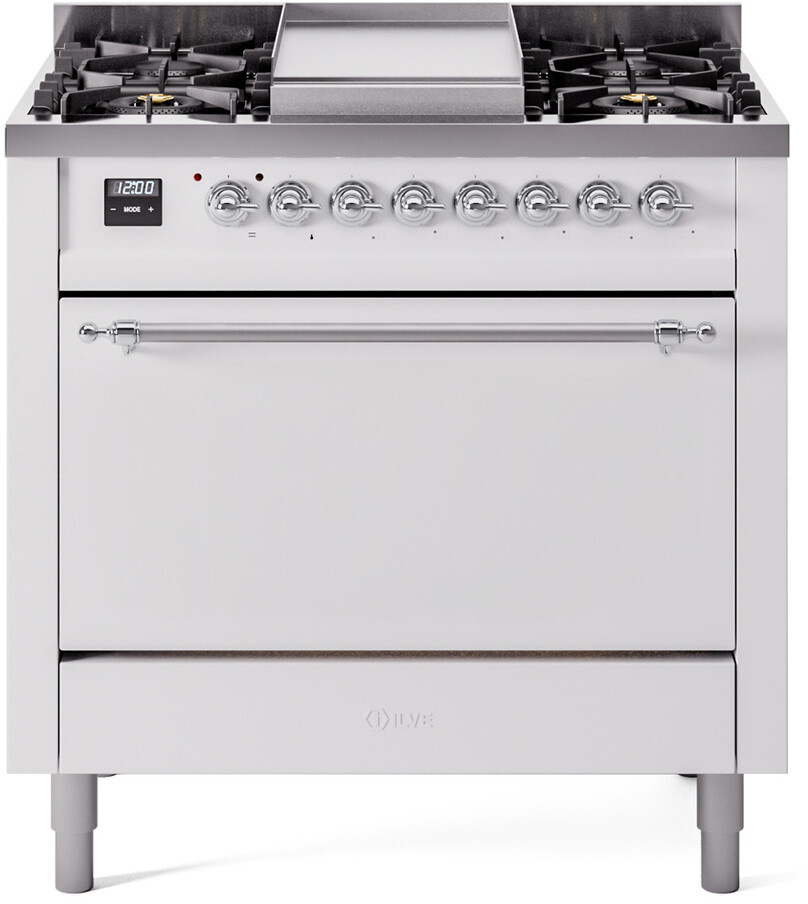 Freestanding Dual Fuel Range with 6 Sealed Burners, 3.5 cu. ft. Oven Capacity, Storage Drawer, and Griddle: White, Chrome Trim. Expand your cooking possibilities with six sealed burners, designed for easy cleaning and even heat distribution. Accommodate large meals effortlessly with a spacious 3.5 cubic feet oven, perfect for family dinners and special occasions. Storage Drawer. Keep your kitchen organized with a built-in storage drawer, ideal for storing cookware and accessories. Add versatility to your cooking with the integrated griddle, perfect for preparing pancakes, grilled sandwiches, and more. With power up to 20000 btu as standard. Optimal supply and perfect distribution of the heat, for all types of cooking. With non-stick nanotechnological treatment. The noble technical characteristics of brass are enriched with a nanotechnological coating that assures easy cleaning, with an elegant Total Black finish. The indestructible cast iron pan supports provide a functional and safe support for the pots. The door hinges are fitted with a shock absorber that makes the closure more gradual and noiseless. Ensure the oven temperature remains constant throughout, without fluctuating, as is the case in conventional ovens. Set at 85F for perfect proofing, or up to 575F for roasting. The grease does not stick to the surface and can therefore be cleaned more easily. Structure in AISI 304 steel with 12/10 thickness, option to choose the ideal combination between a gas hob with up to 9 burners or induction, mixed and in various setups. The quick oven preheating function allows it to reach the desired temperature in a short time and you can then choose the best-suited cooking mode for the dish. It also works as rapid defrosting when a low temperature is set (85F - 105F). Pizza function. Quick start. Multiple fan cooking. Intensive cooking. Fan grill cooking. Grill cooking with closed-door. Cooking from above. Cooking from below. Static normal cooking. Series: Nostalgie II. Color: White - Chrome Trim. Fuel Type: Dual Fuel. Gas Type: Natural Gas. Installation Type: Freestanding. Sabbath Mode: No. Number of Racks: 2. Drawer Type: Storage Drawer. Display Type: LCD Display. Timer: Yes. Cooking Probe: Yes. Rotisserie: Yes. Soft Close Door: Yes. Cooktop Configuration: 6 Sealed Burners + Griddle. Burner/Element Type: Sealed Burner. Number of Burners/Elements: 6. Griddle: Yes. Grill: No. French Top: No. Burner Output 1: 25000 BTU/h - 900 BTU/h. Burner Output 2: 7000 BTU/h - 1400 BTU/h. Burner Output 3: 25000 BTU/h - 900 BTU/h. Burner Output 4: 10500 BTU/h - 2000 BTU/h. Burner Output 5: 10500 BTU/h - 2000 BTU/h. Burner Output 6: 10500 BTU/h - 2000 BTU/h. Oven Control Type: Knobs. Oven Door Type: Solid Door. Number of Ovens: Single Oven. Main Oven Capacity (cu. ft.): 3.5. Oven Cleaning Type: Easy Clean Enamel Cavities. Main Oven Type: UOV 80 M. Voltage: 240 V. Amps: 15.4 A. ADA Compliant: No. Star-K Certified: No. Width: 35 3/4". Depth: 25". Height: 36 1/4" - 38 1/2". Exterior Width: 36".