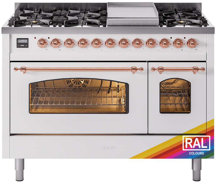 Freestanding Dual Fuel Range with 8 Sealed Burners, 5.02 cu. ft. Total Capacity, Storage Drawer, and Griddle: RAL Color, Copper Trim. Enjoy maximum versatility and control with eight sealed burners, perfect for everything from delicate simmering to high-heat searing. With a spacious 5.02 cubic feet oven capacity, you can easily accommodate multiple dishes at once, making it ideal for large families and entertaining. Keep your kitchen organized with the convenient storage drawer, providing extra space for cookware and accessories. The included griddle offers a large, flat cooking surface, perfect for pancakes, sandwiches, and more, adding versatility to your cooking options. With power up to 25000 btu as standard. Optimal supply and perfect distribution of the heat, for all types of cooking. With non-stick nanotechnological treatment. The noble technical characteristics of brass are enriched with a nanotechnological coating that assures easy cleaning, with an elegant Total Black finish. Structure in AISI 304 steel with 12/10 thickness, option to choose the ideal combination between a gas hob with up to 9 burners or induction, mixed and in various setups. The indestructible cast iron pan supports provide a functional and safe support for the pots. The electronic control ensures that the temperature of the oven remains constant throughout, without fluctuating, as is the case in conventional ovens. It can be set with precision starting from 85F, for perfect proofing, up to 575F, for roasting. The door hinges are fitted with a shock absorber that makes the closure more gradual and noiseless. The quick oven preheating function allows it to reach the desired temperature in a short time and you can then choose the best-suited cooking mode for the dish. It also works as rapid defrosting when a low temperature is set (85F - 105F). Pizza function. Quick start. Multiple fan cooking. Intensive cooking. Fan grill cooking. Grill cooking with closed-door. Cooking from above. Cooking from below. Static normal cooking. Grill cooking with closed-door. Cooking from above. Cooking from below. Static normal cooking. Series: Nostalgie II. Fuel Type: Dual Fuel. Gas Type: Natural Gas. Installation Type: Freestanding. Sabbath Mode: No. Number of Racks: 2. Drawer Type: Storage Drawer. Display Type: LCD Display. Timer: Yes. Cooking Probe: Yes. Rotisserie: Yes. Soft Close Door: Yes. Cooktop Configuration: 8 Sealed Burners + Griddle. Burner/Element Type: Sealed Burner. Griddle: Yes. Grill: No. Oven Control Type: Knobs. Oven Door Type: Triple Glass Door. Number of Ovens: Double Oven. Main Oven Capacity (cu. ft.): 3.5. Second Oven Capacity (cu. ft.): 1.52. Oven Cleaning Type: Easy Clean Enamel Cavities. Main Oven Type: UOV 80 M. Second Oven Type: UOV 30 E. Oven Total Capacity (cu. ft.): 5.02. Voltage: 240 V. Amps: 25.8 A. ADA Compliant: No. Star-K Certified: No. Width: 47 7/8". Depth: 25". Height: 36 1/4" - 38 1/2". Exterior Width: 48".